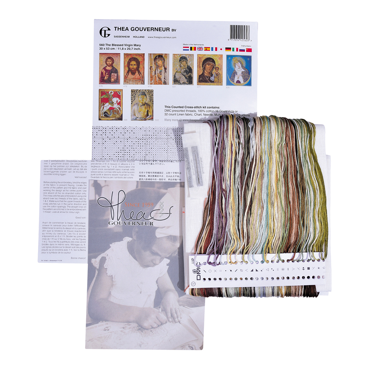 Наборы Thea Gouverneur укомплектованы качественными материалами, такими как мулине DMC из 100% хлопка и разные виды тканей для вышивания производства Zweigart. Наборы обозначенные буквой А после номера содержат в составе канву Aida, если в артикуле есть обозначение .05 – то этот набор укомплектован канвой Aida чёрного цвета. Также в ассортименте есть наборы на 100% льне и канве Jobelan. Черно-белые схемы тщательно прорабатываются вручную. Используется богатая цветовая палитра ниток, но в ассортименте компании есть и монохромные дизайны. Нитки разобраны по символам и закреплены на органайзере. Стрелка на бумажном органайзере указывает вверх, определяя правильность чтения символов.