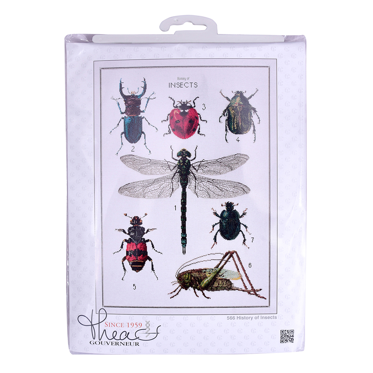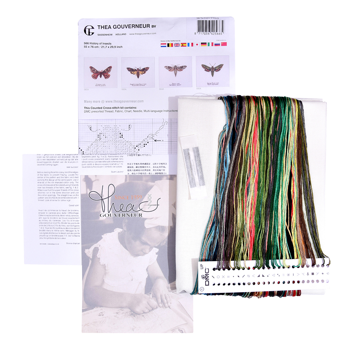 Наборы Thea Gouverneur укомплектованы качественными материалами, такими как мулине DMC из 100% хлопка и разные виды тканей для вышивания производства Zweigart. Наборы обозначенные буквой А после номера содержат в составе канву Aida, если в артикуле есть обозначение .05 – то этот набор укомплектован канвой Aida чёрного цвета. Также в ассортименте есть наборы на 100% льне и канве Jobelan. Черно-белые схемы тщательно прорабатываются вручную. Используется богатая цветовая палитра ниток, но в ассортименте компании есть и монохромные дизайны. Нитки разобраны по символам и закреплены на органайзере. Стрелка на бумажном органайзере указывает вверх, определяя правильность чтения символов.