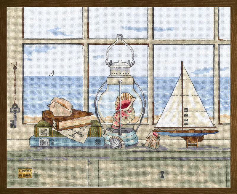 Посмотрите в окно на океан с книгами на полке, красочной раковиной в фонаре и парусной лодкой и от этого вида нельзя не прийти в восторг. Это захватывающий и веселый дизайн вышивки счетным крестом идеально подойдет для вашей любимой комнаты, чтобы напомнить вам о хороших воспоминаниях лета и моря.