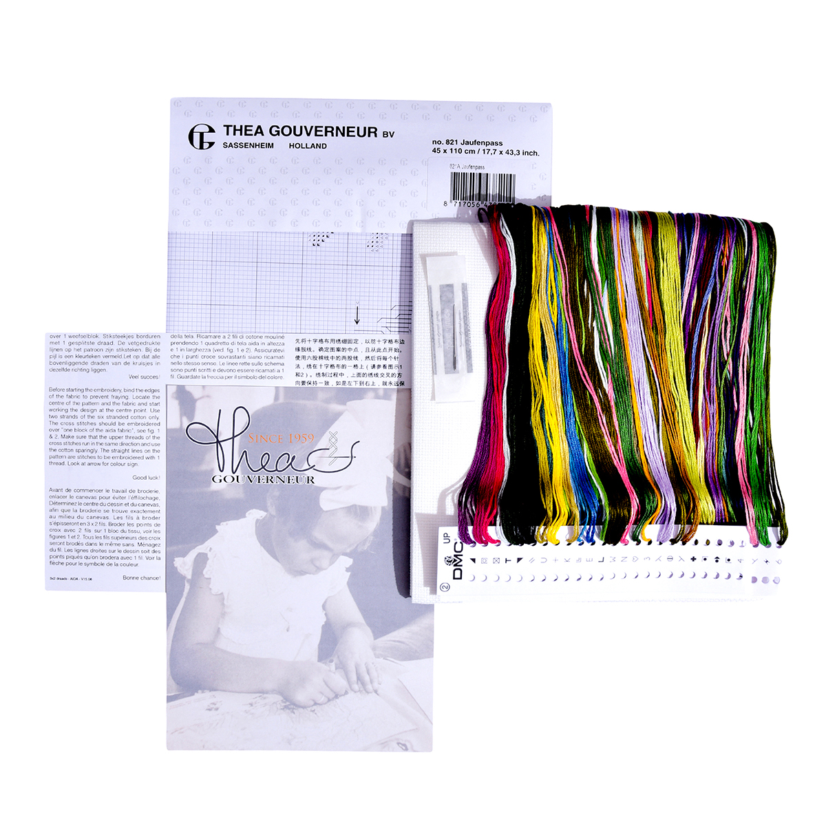 Наборы Thea Gouverneur  укомплектованы качественными материалами, такими как мулине DMC из 100% хлопка и разные виды тканей для вышивания производства Zweigart. Наборы обозначенные буквой А после номера содержат в составе канву Aida, если в артикуле есть обозначение .05 – то этот набор укомплектован канвой Aida чёрного цвета. Также в ассортименте есть наборы на 100% льне и канве Jobelan. Черно-белые схемы тщательно прорабатываются вручную. Используется богатая цветовая палитра ниток, но в ассортименте компании есть и монохромные дизайны. Нитки разобраны по символам и закреплены на органайзере. Стрелка на бумажном органайзере указывает вверх, определяя правильность чтения символов.
