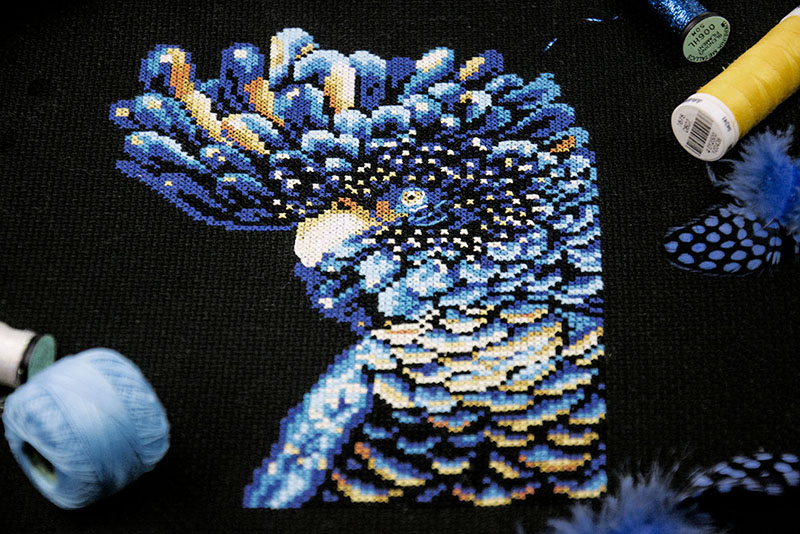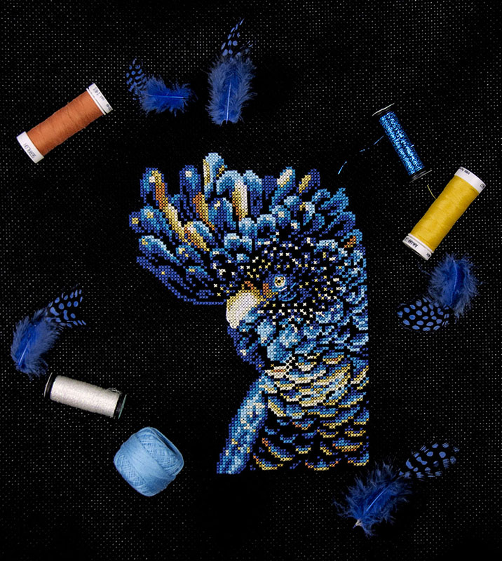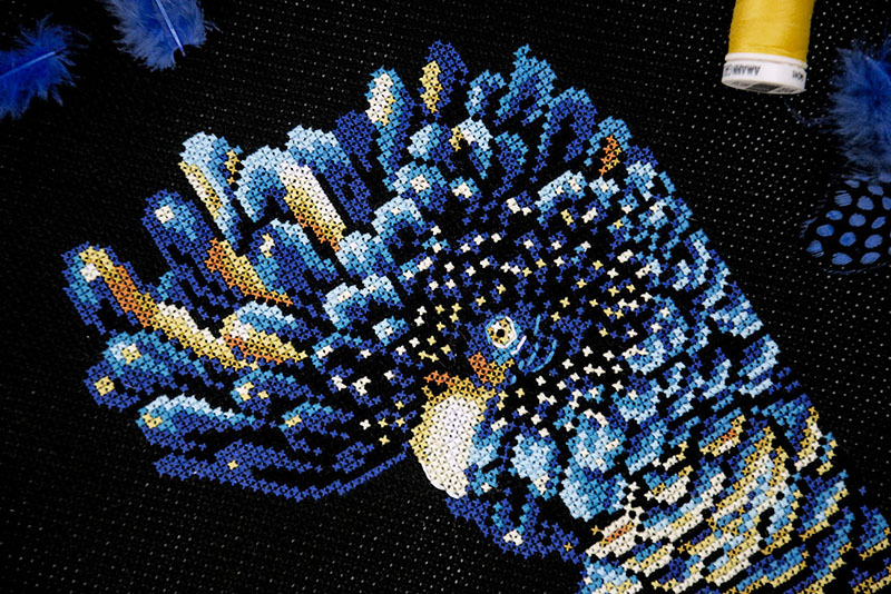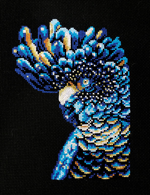 Благодаря черному фону и насыщенным цветам нитей, вышивка получается яркой и привлекающей внимание. Сюжет можно использовать как для создания предмета интерьера, так и для декора сумки или куртки.