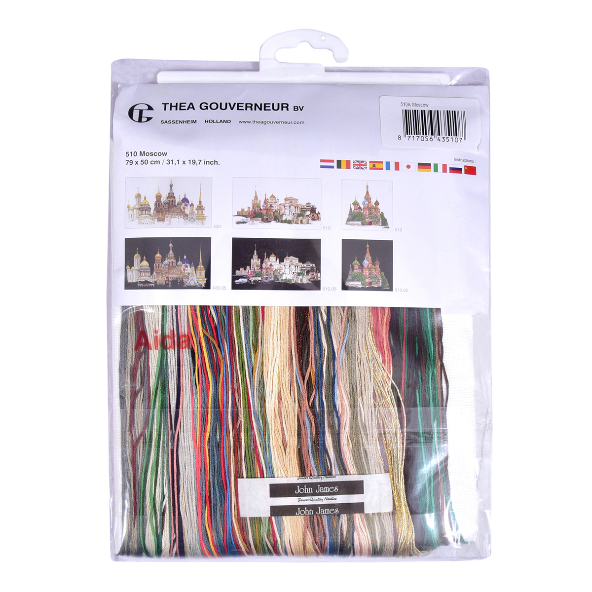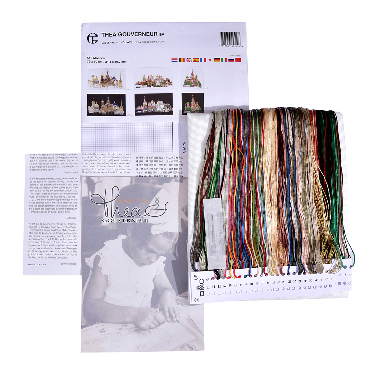 Наборы Thea Gouverneur укомплектованы качественными материалами, такими как мулине DMC из 100% хлопка и разные виды тканей для вышивания производства Zweigart. Наборы обозначенные буквой А после номера содержат в составе канву Aida, если в артикуле есть обозначение .05 – то этот набор укомплектован канвой Aida чёрного цвета. Также в ассортименте есть наборы на 100% льне и канве Jobelan. Черно-белые схемы тщательно прорабатываются вручную. Используется богатая цветовая палитра ниток, но в ассортименте компании есть и монохромные дизайны. Нитки разобраны по символам и закреплены на органайзере. Стрелка на бумажном органайзере указывает вверх, определяя правильность чтения символов.