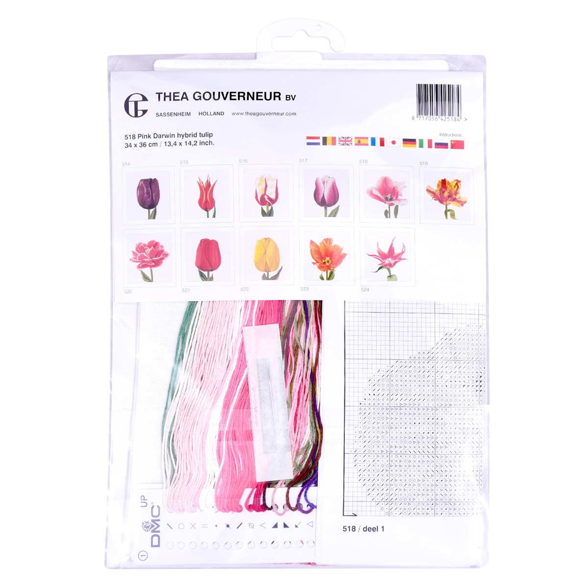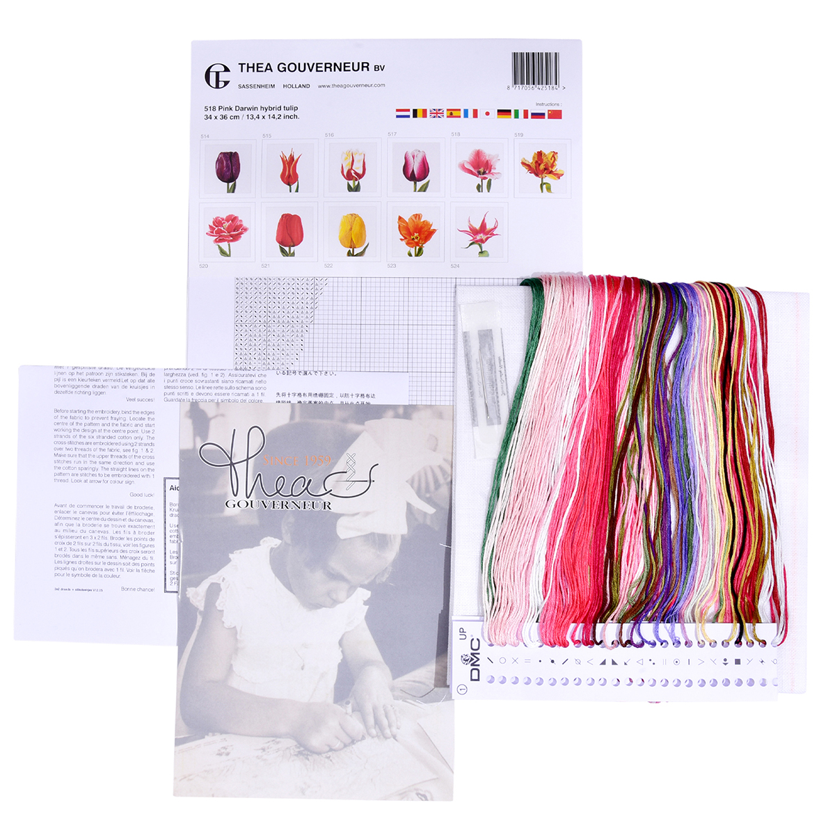 Наборы Thea Gouverneur укомплектованы качественными материалами, такими как мулине DMC из 100% хлопка и разные виды тканей для вышивания производства Zweigart. Наборы обозначенные буквой А после номера содержат в составе канву Aida, если в артикуле есть обозначение .05 – то этот набор укомплектован канвой Aida чёрного цвета. Также в ассортименте есть наборы на 100% льне и канве Jobelan. Черно-белые схемы тщательно прорабатываются вручную. Используется богатая цветовая палитра ниток, но в ассортименте компании есть и монохромные дизайны. Нитки разобраны по символам и закреплены на органайзере. Стрелка на бумажном органайзере указывает вверх, определяя правильность чтения символов.