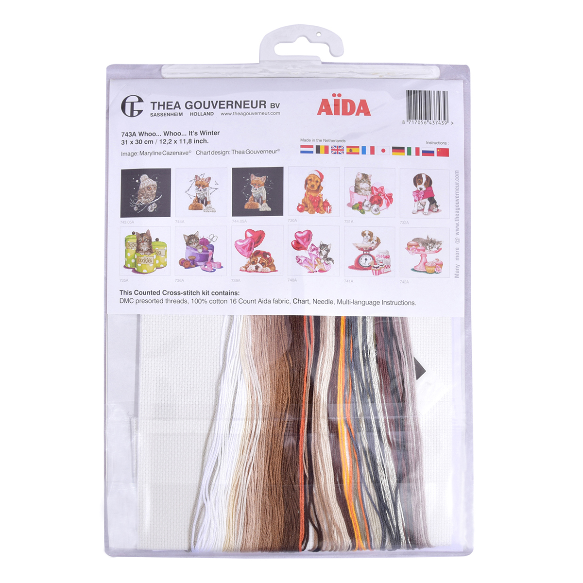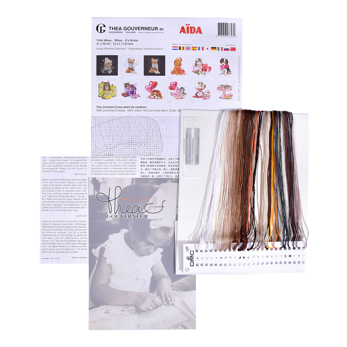 Наборы Thea Gouverneur укомплектованы качественными материалами, такими как мулине DMC из 100% хлопка и разные виды тканей для вышивания производства Zweigart. Наборы обозначенные буквой А после номера содержат в составе канву Aida, если в артикуле есть обозначение .05 – то этот набор укомплектован канвой Aida чёрного цвета. Также в ассортименте есть наборы на 100% льне и канве Jobelan. Черно-белые схемы тщательно прорабатываются вручную. Используется богатая цветовая палитра ниток, но в ассортименте компании есть и монохромные дизайны. Нитки разобраны по символам и закреплены на органайзере. Стрелка на бумажном органайзере указывает вверх, определяя правильность чтения символов.