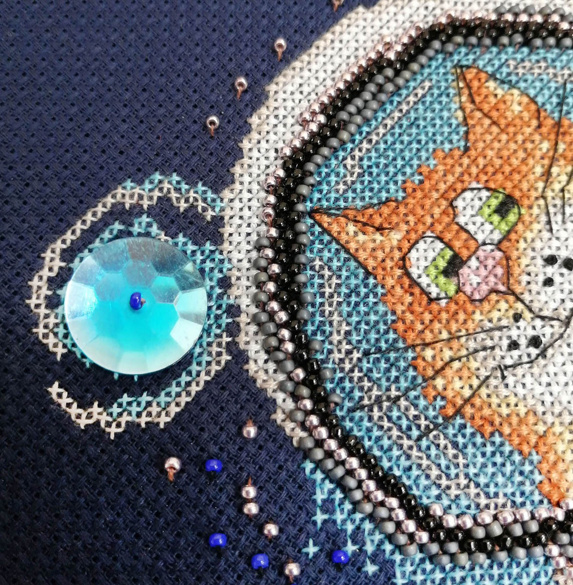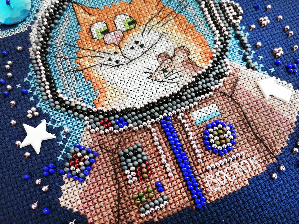 Канва Aida 14 ct темно-синяя, мулине Finca 12 цв., бисер, декоративные элементы, игла, инструкция, схема черно-белая