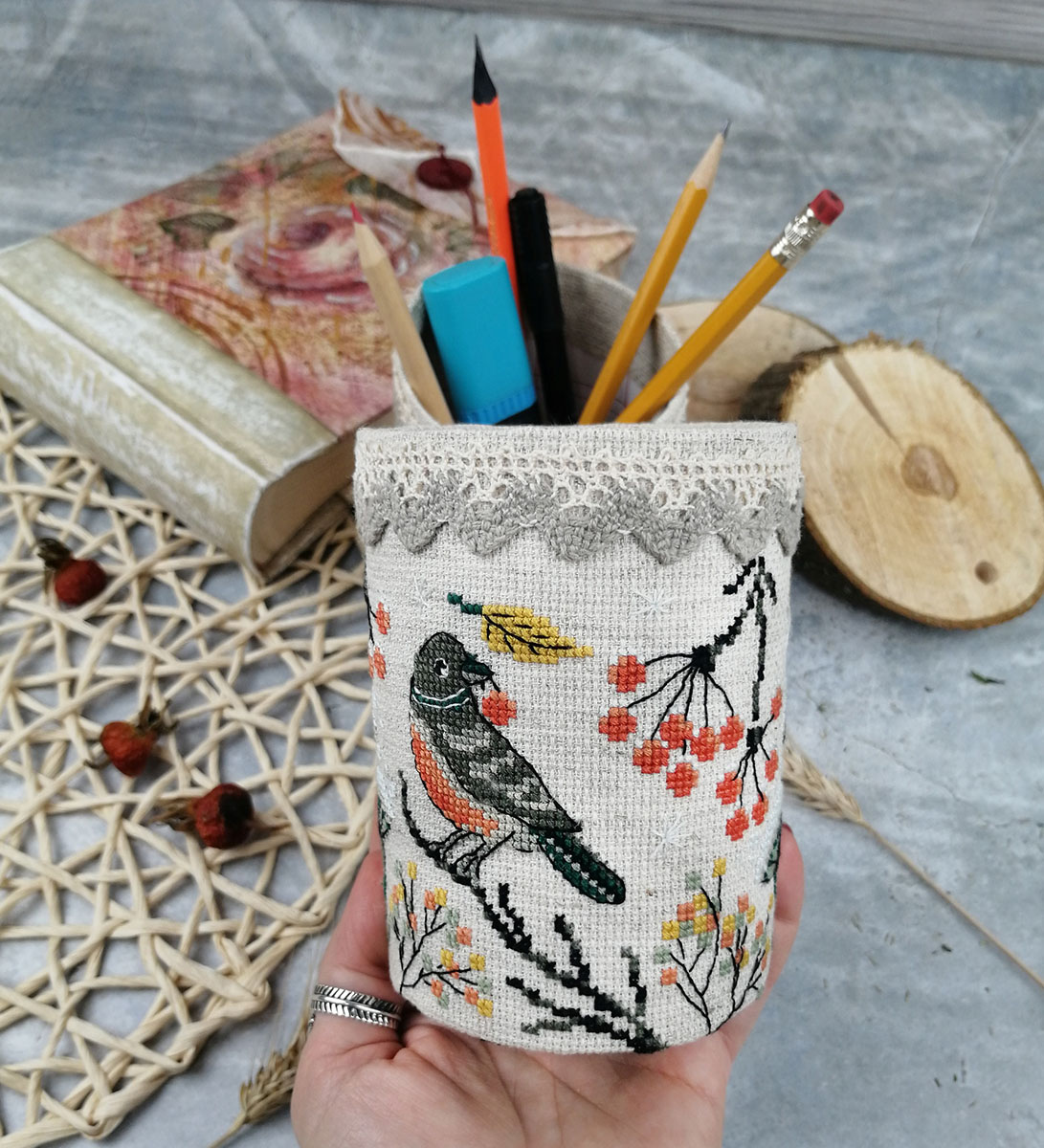 Фольклорная тематика по-своему притягательна. В нашей новой карандашнице очаровательные птички на фоне присыпанных снегом сухоцветов в период предзимья. Такая интересная и нужная вещь получится из набора "Птички".