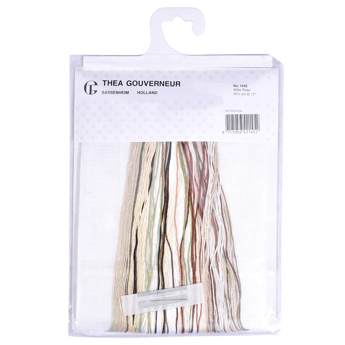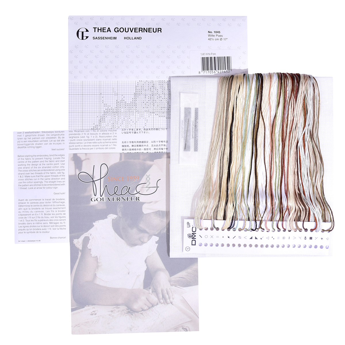 Наборы Thea Gouverneur укомплектованы качественными материалами, такими как мулине DMC из 100% хлопка и разные виды тканей для вышивания производства Zweigart. Наборы обозначенные буквой А после номера содержат в составе канву Aida, если в артикуле есть обозначение .05 – то этот набор укомплектован канвой Aida чёрного цвета. Также в ассортименте есть наборы на 100% льне и канве Jobelan. Черно-белые схемы тщательно прорабатываются вручную. Используется богатая цветовая палитра ниток, но в ассортименте компании есть и монохромные дизайны. Нитки разобраны по символам и закреплены на органайзере. Стрелка на бумажном органайзере указывает вверх, определяя правильность чтения символов.