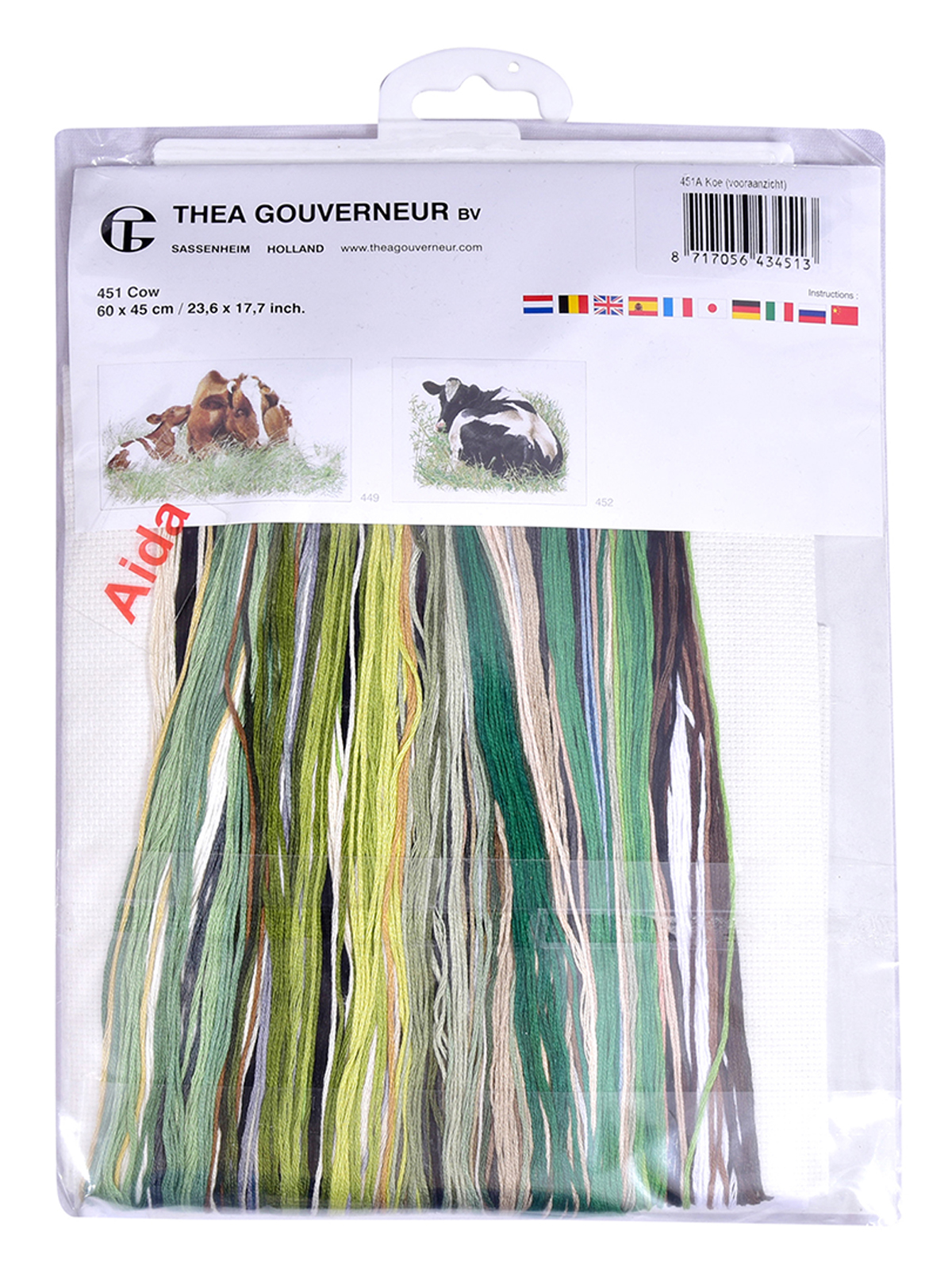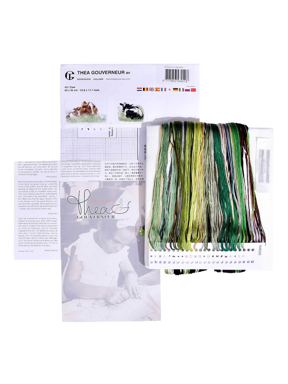 Наборы Thea Gouverneur  укомплектованы качественными материалами, такими как мулине DMC из 100% хлопка и разные виды тканей для вышивания производства Zweigart. Наборы обозначенные буквой А после номера содержат в составе канву Aida, если в артикуле есть обозначение .05 – то этот набор укомплектован канвой Aida чёрного цвета. Также в ассортименте есть наборы на 100% льне и канве Jobelan. Черно-белые схемы тщательно прорабатываются вручную. Используется богатая цветовая палитра ниток, но в ассортименте компании есть и монохромные дизайны. Нитки разобраны по символам и закреплены на органайзере. Стрелка на бумажном органайзере указывает вверх, определяя правильность чтения символов.