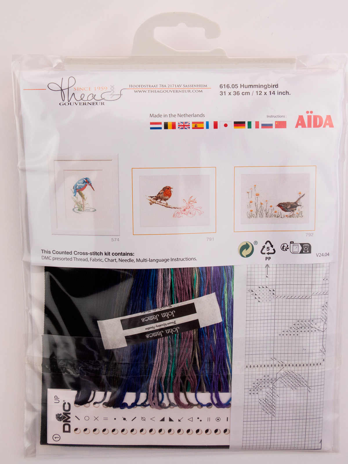 Наборы Thea Gouverneur укомплектованы качественными материалами, такими как мулине DMC из 100% хлопка и разные виды тканей для вышивания производства Zweigart. Наборы обозначенные буквой А после номера содержат в составе канву Aida, если в артикуле есть обозначение .05 – то этот набор укомплектован канвой Aida чёрного цвета. Также в ассортименте есть наборы на 100% льне и канве Jobelan. Черно-белые схемы тщательно прорабатываются вручную. Используется богатая цветовая палитра ниток, но в ассортименте компании есть и монохромные дизайны. Нитки разобраны по символам и закреплены на органайзере. Стрелка на бумажном органайзере указывает вверх, определяя правильность чтения символов.