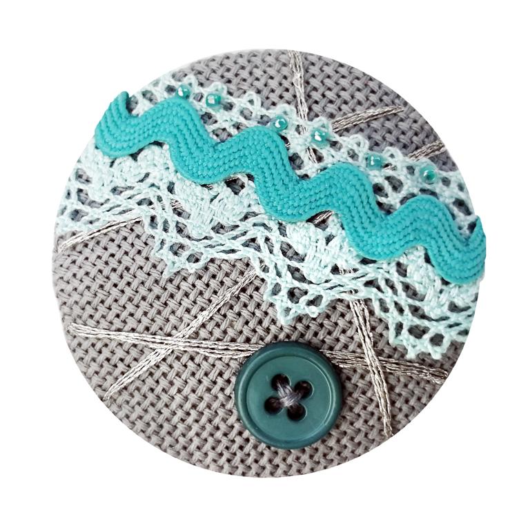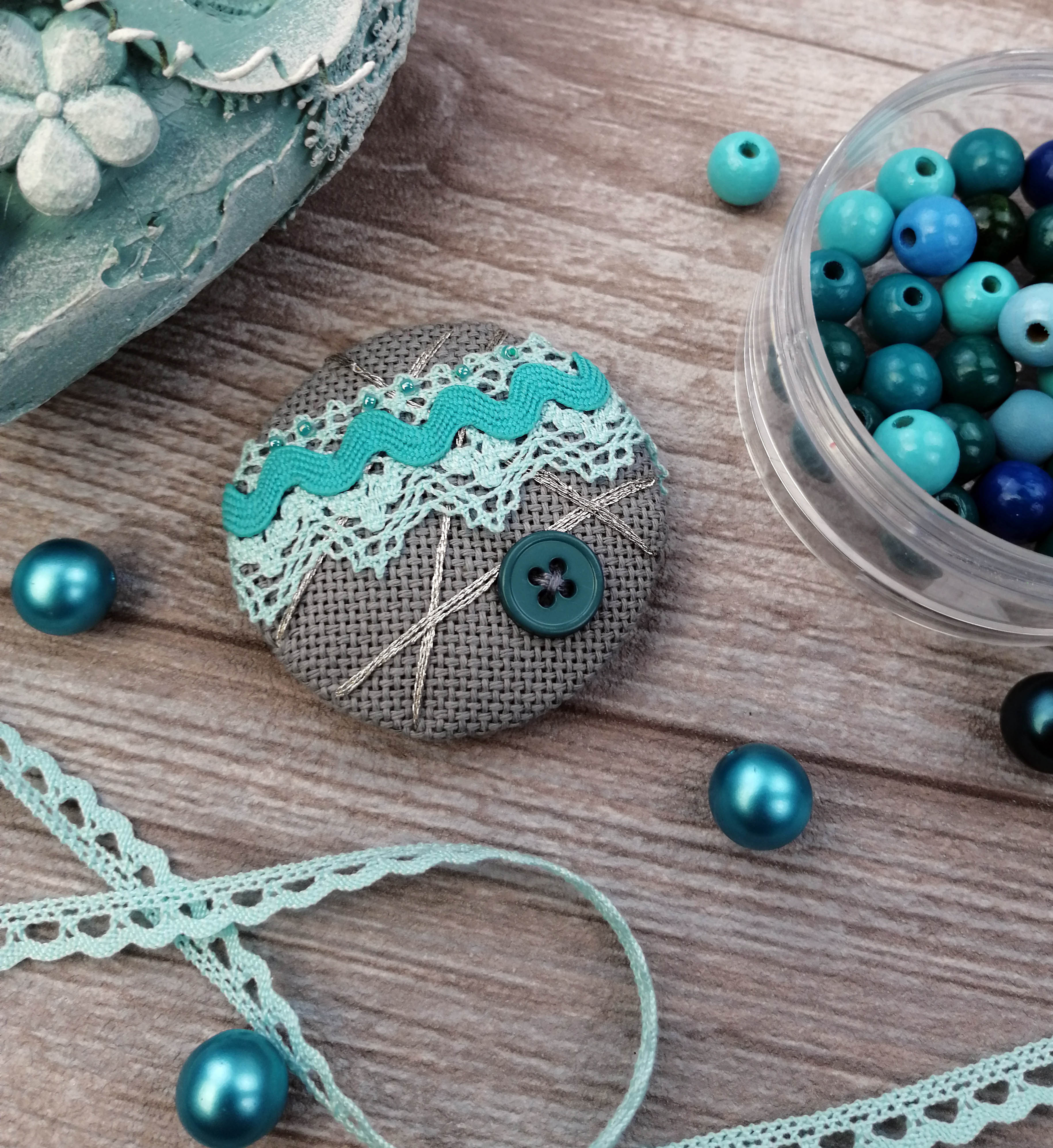 Ткань Zweigart, кружево Iemesa, тесьма, фетр Hemline, застежка Efco, нитки, пуговица, бисер, наполнитель, игла, подробная инструкция.