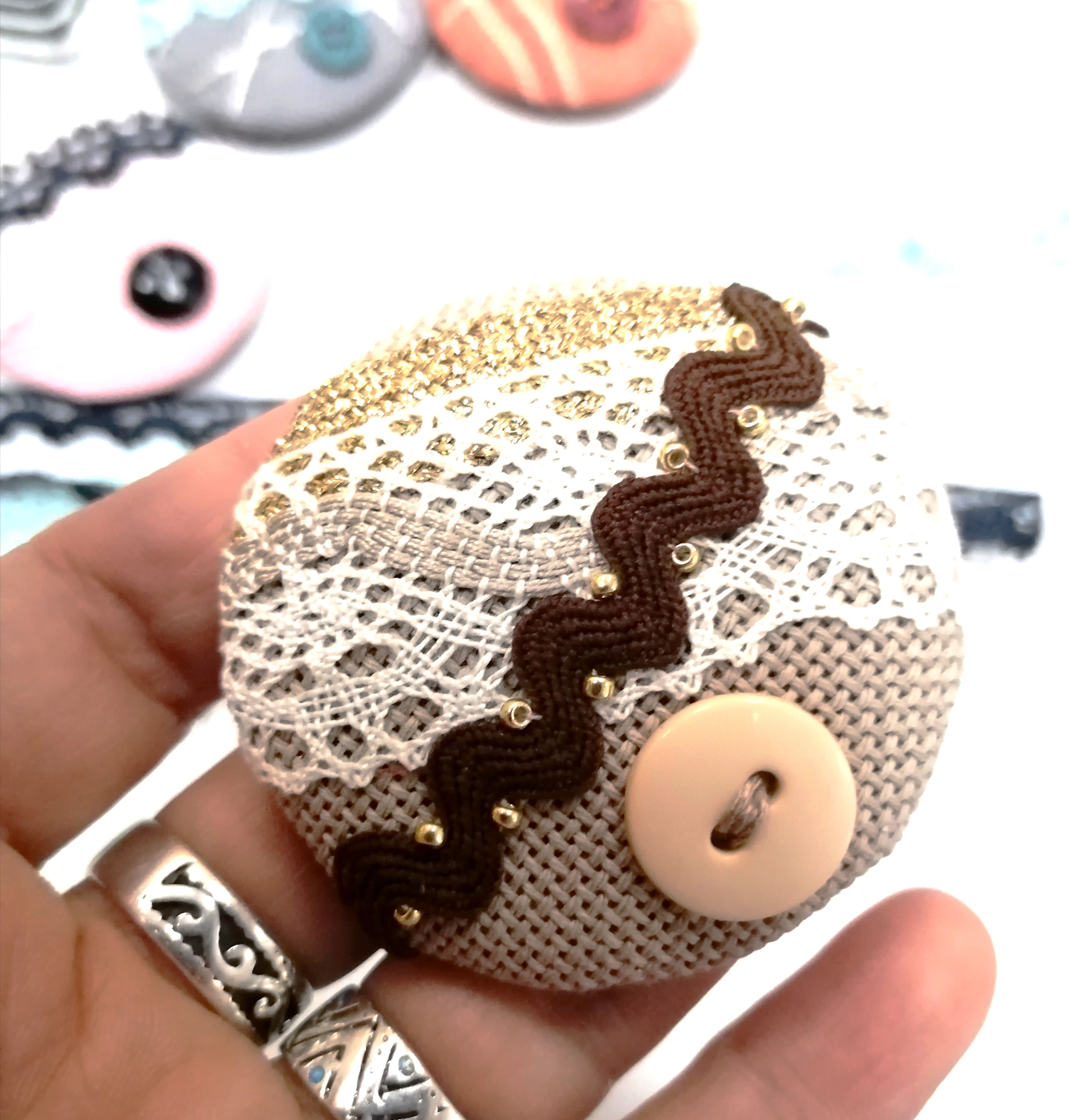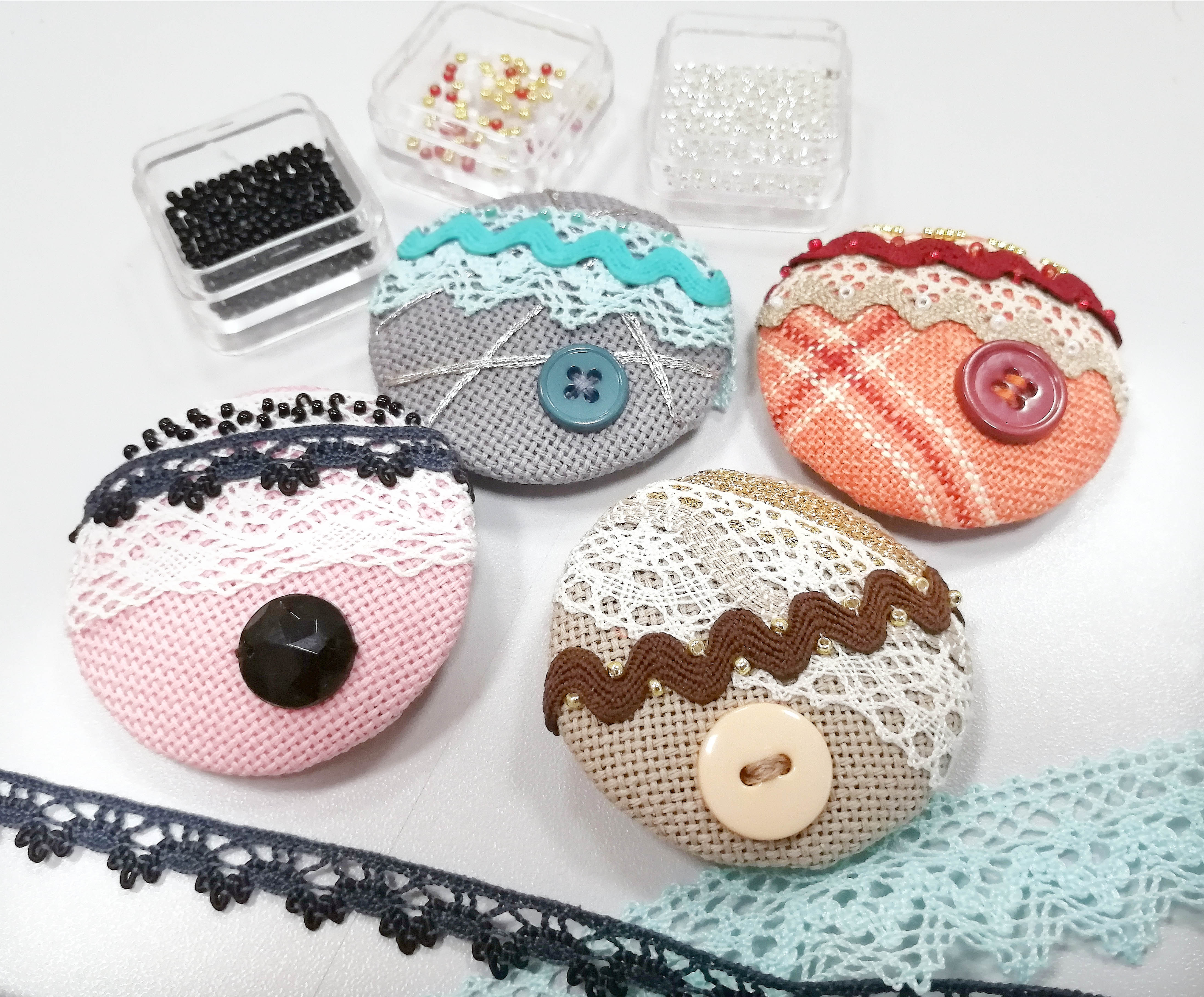 Ткань Zweigart, кружево Iemesa, тесьма, фетр Hemline, застежка Efco, нитки, пуговица, бисер, наполнитель, игла, подробная инструкция.