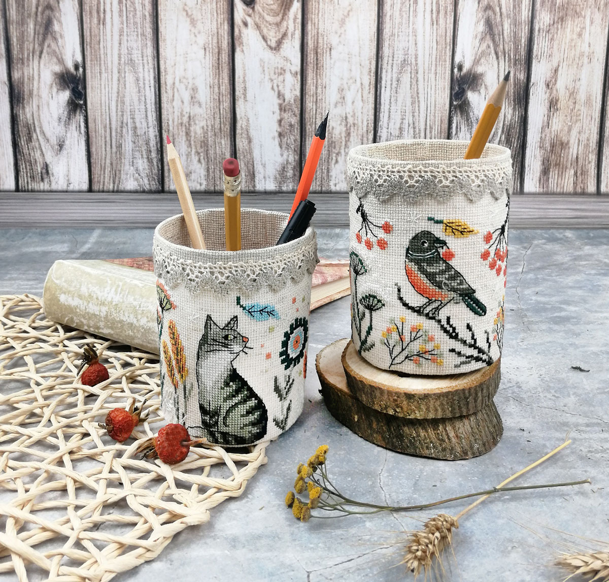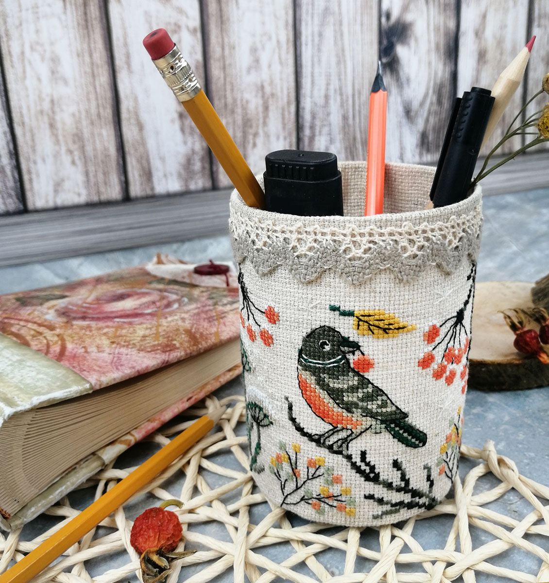 Фольклорная тематика по-своему притягательна. В нашей новой карандашнице очаровательные птички на фоне присыпанных снегом сухоцветов в период предзимья. Такая интересная и нужная вещь получится из набора "Птички".