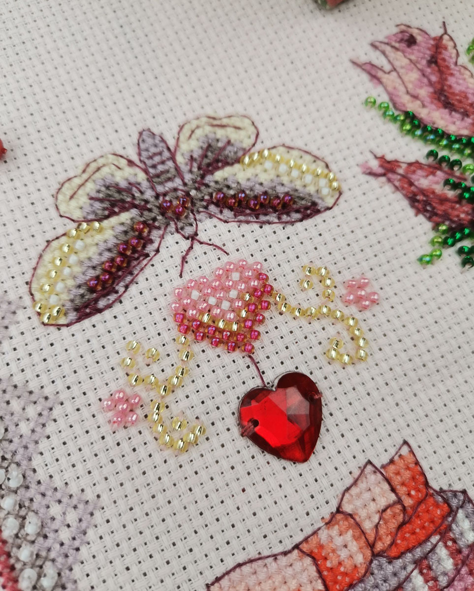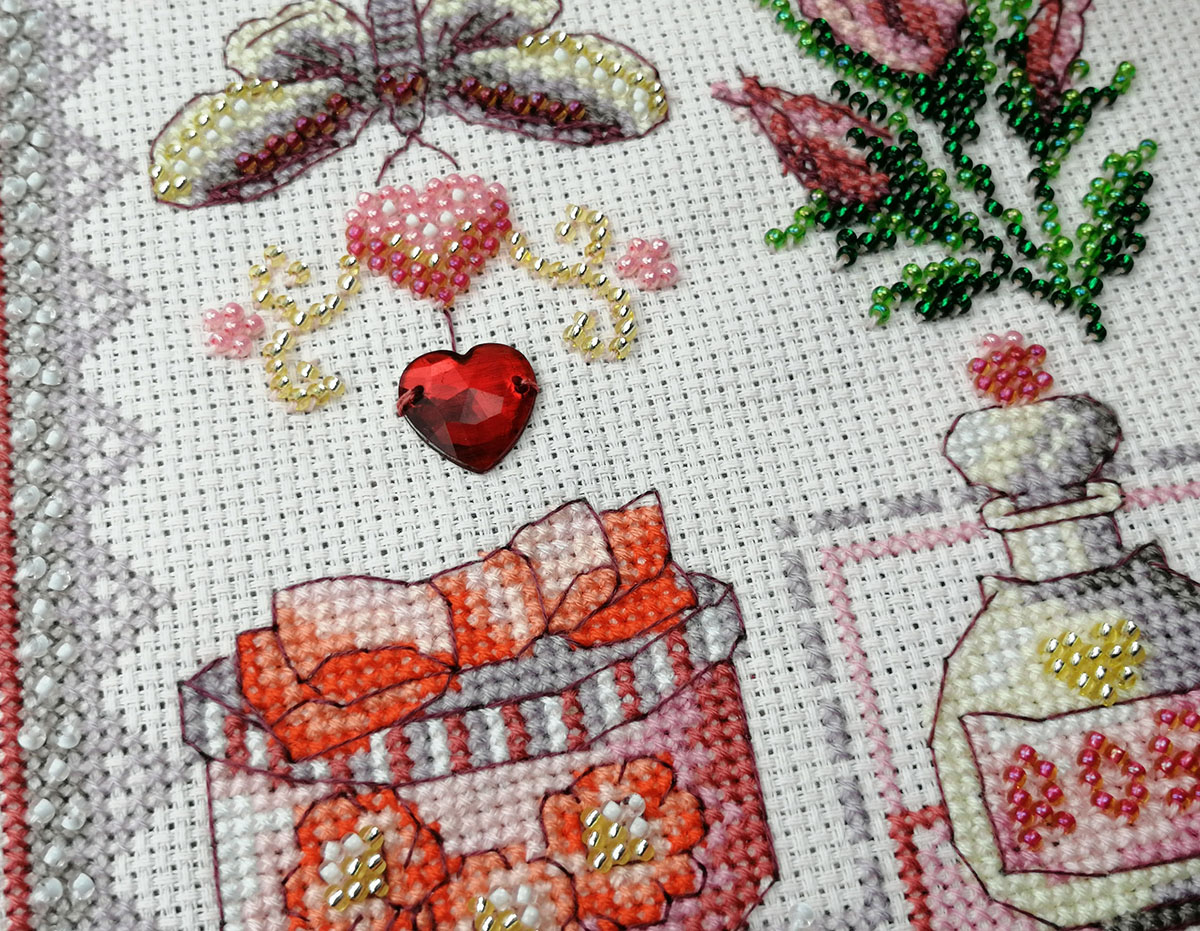Серию объединяют размер, основа Аида 14ct, частичная вышивка бисером и декоративные пришивные элементы. Мулине Finca не разобраны на планшетки, а связаны узелком. Схема и инструкция черно-белая. Электронная схема XSD, QR код в наборе, указание о наличие схемы - знак на обложке.
