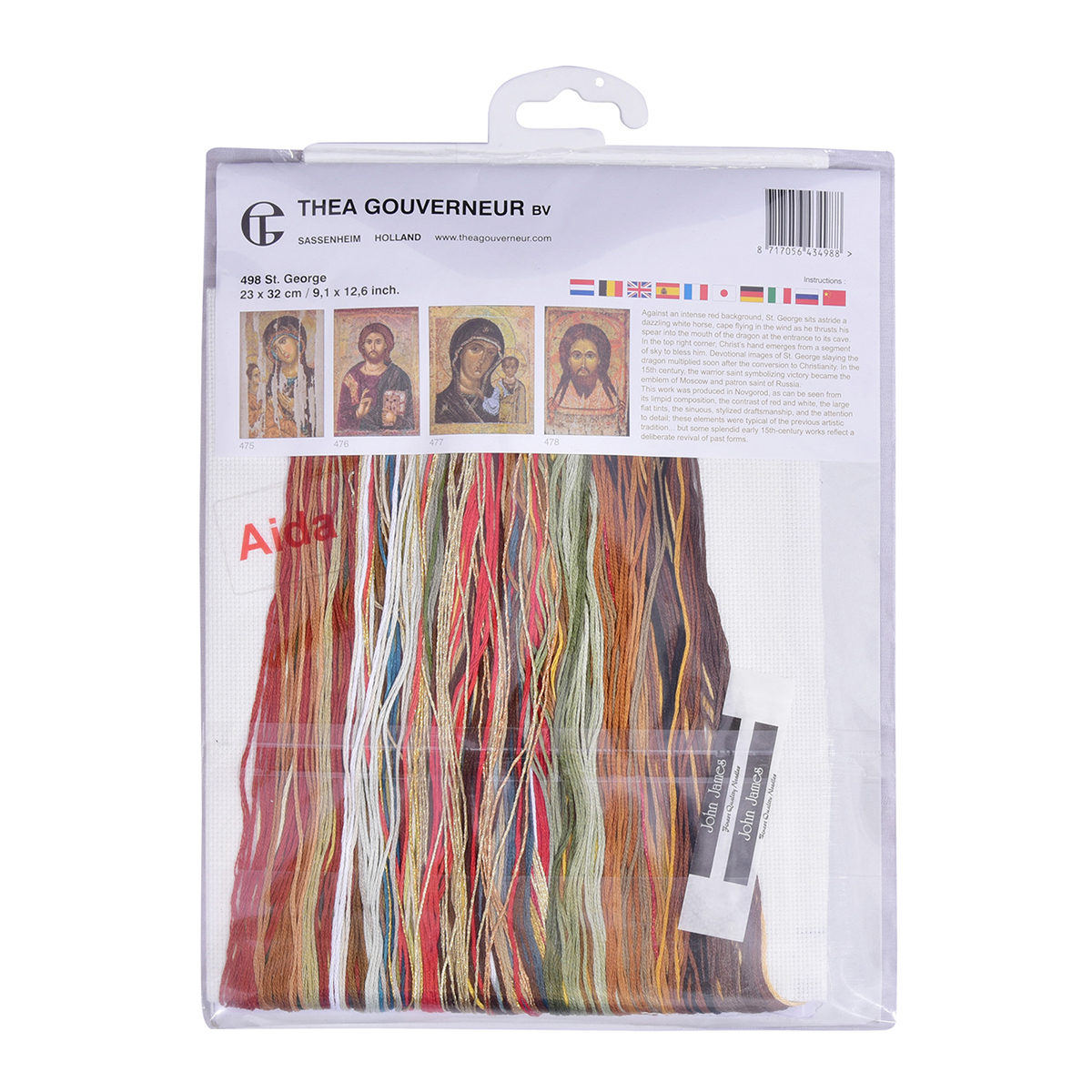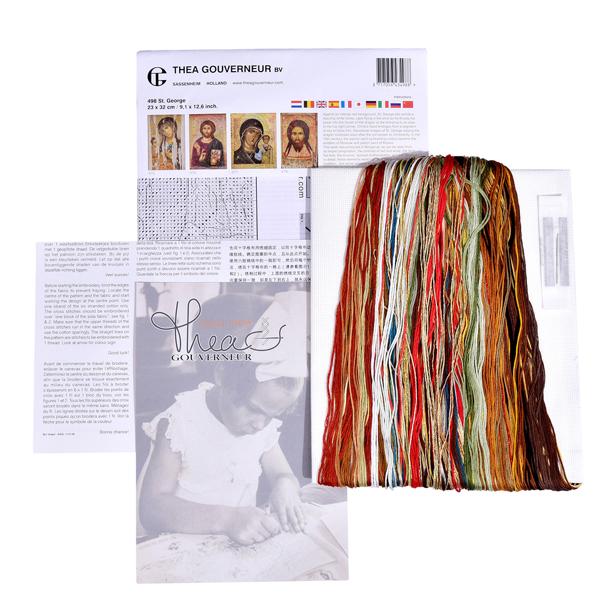 Наборы Thea Gouverneur укомплектованы качественными материалами, такими как мулине DMC из 100% хлопка и разные виды тканей для вышивания производства Zweigart. Наборы обозначенные буквой А после номера содержат в составе канву Aida, если в артикуле есть обозначение .05 – то этот набор укомплектован канвой Aida чёрного цвета. Также в ассортименте есть наборы на 100% льне и канве Jobelan. Черно-белые схемы тщательно прорабатываются вручную. Используется богатая цветовая палитра ниток, но в ассортименте компании есть и монохромные дизайны. Нитки разобраны по символам и закреплены на органайзере. Стрелка на бумажном органайзере указывает вверх, определяя правильность чтения символов.