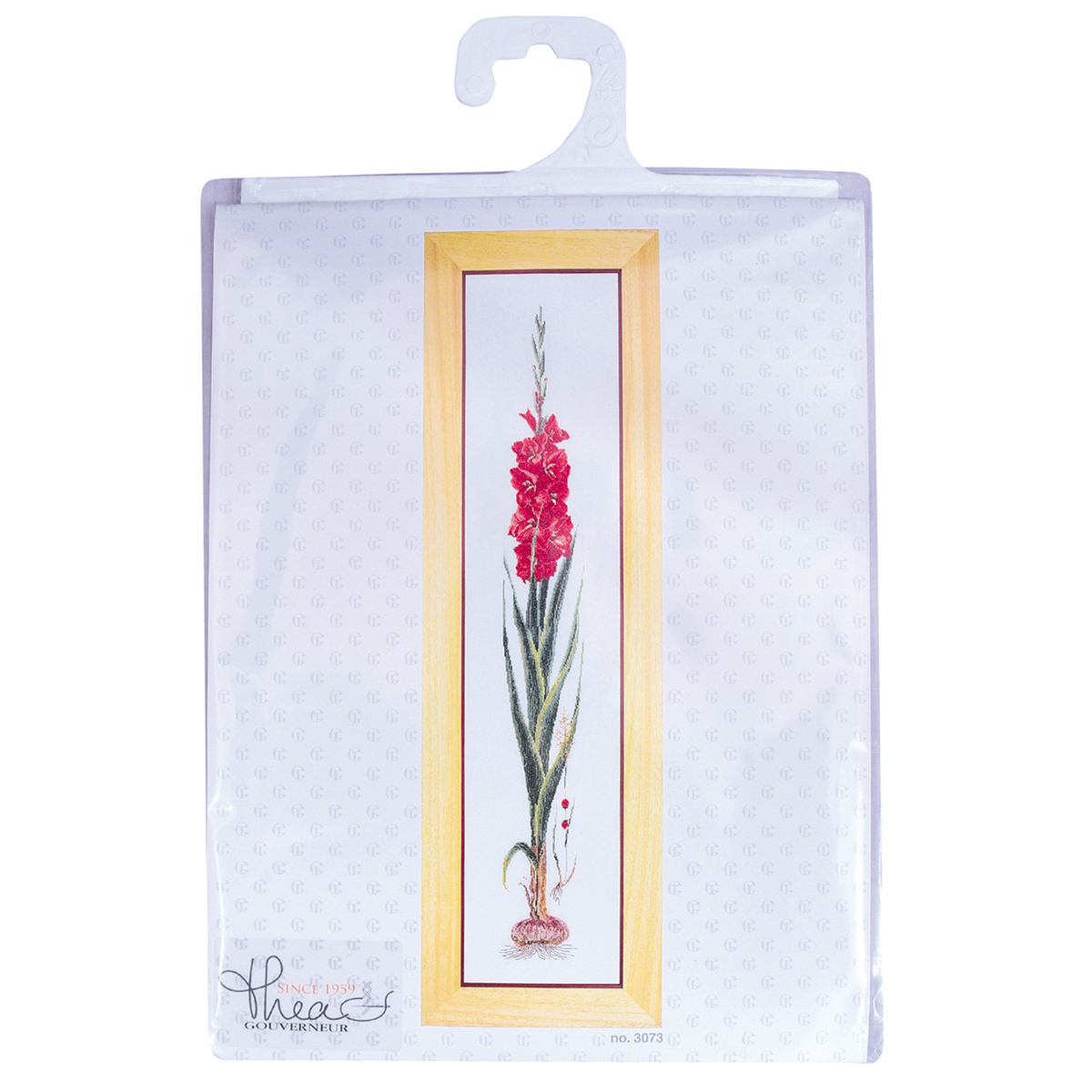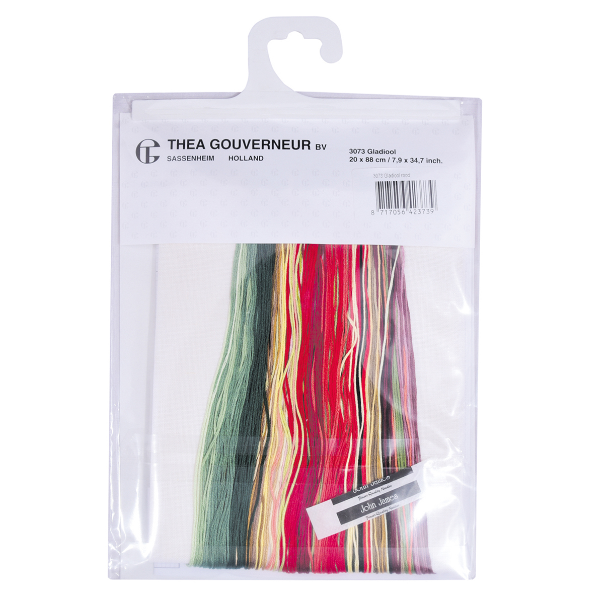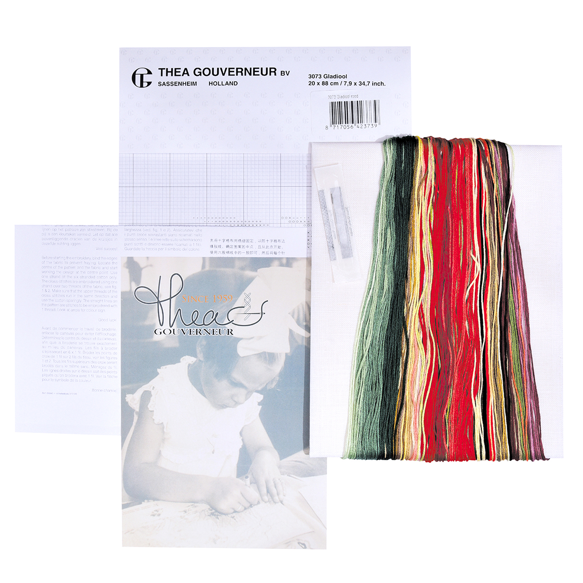 Наборы Thea Gouverneur укомплектованы качественными материалами, такими как мулине DMC из 100% хлопка и разные виды тканей для вышивания производства Zweigart. Наборы обозначенные буквой А после номера содержат в составе канву Aida, если в артикуле есть обозначение .05 – то этот набор укомплектован канвой Aida чёрного цвета. Также в ассортименте есть наборы на 100% льне и канве Jobelan. Черно-белые схемы тщательно прорабатываются вручную. Используется богатая цветовая палитра ниток, но в ассортименте компании есть и монохромные дизайны. Нитки разобраны по символам и закреплены на органайзере. Стрелка на бумажном органайзере указывает вверх, определяя правильность чтения символов.