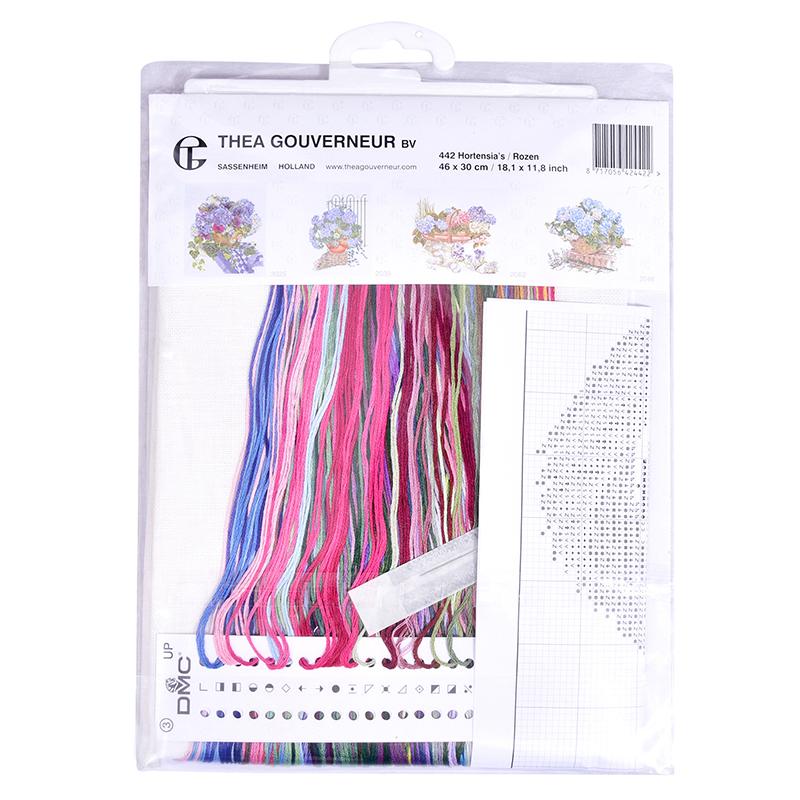 Наборы Thea Gouverneur укомплектованы качественными материалами, такими как мулине DMC из 100% хлопка и разные виды тканей для вышивания производства Zweigart. Наборы обозначенные буквой А после номера содержат в составе канву Aida, если в артикуле есть обозначение .05 – то этот набор укомплектован канвой Aida чёрного цвета. Также в ассортименте есть наборы на 100% льне и канве Jobelan. Черно-белые схемы тщательно прорабатываются вручную. Используется богатая цветовая палитра ниток, но в ассортименте компании есть и монохромные дизайны. Нитки разобраны по символам и закреплены на органайзере. Стрелка на бумажном органайзере указывает вверх, определяя правильность чтения символов.