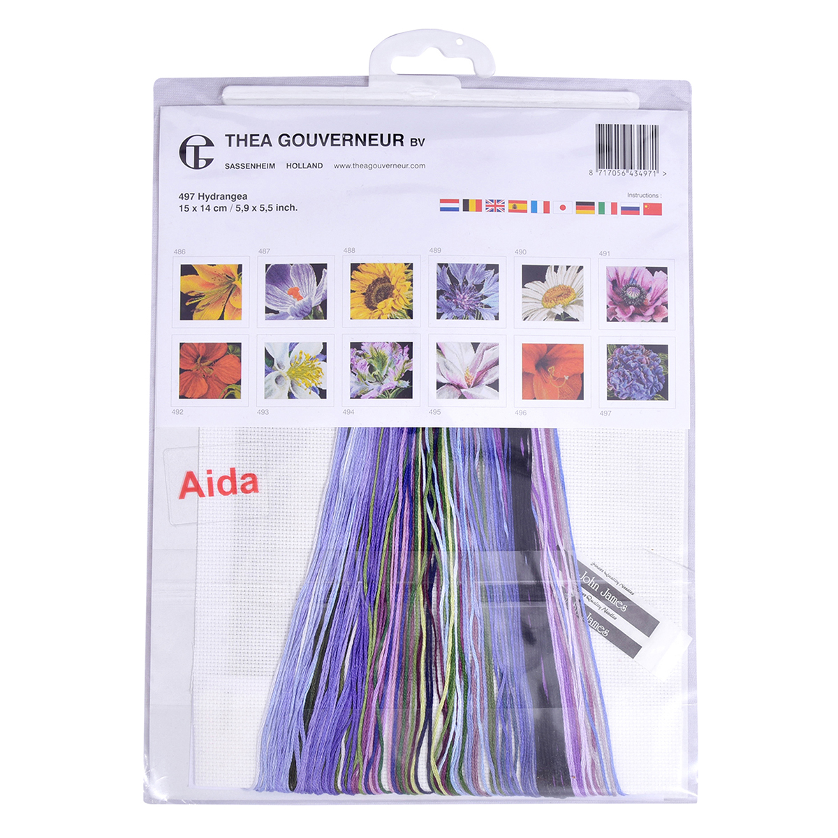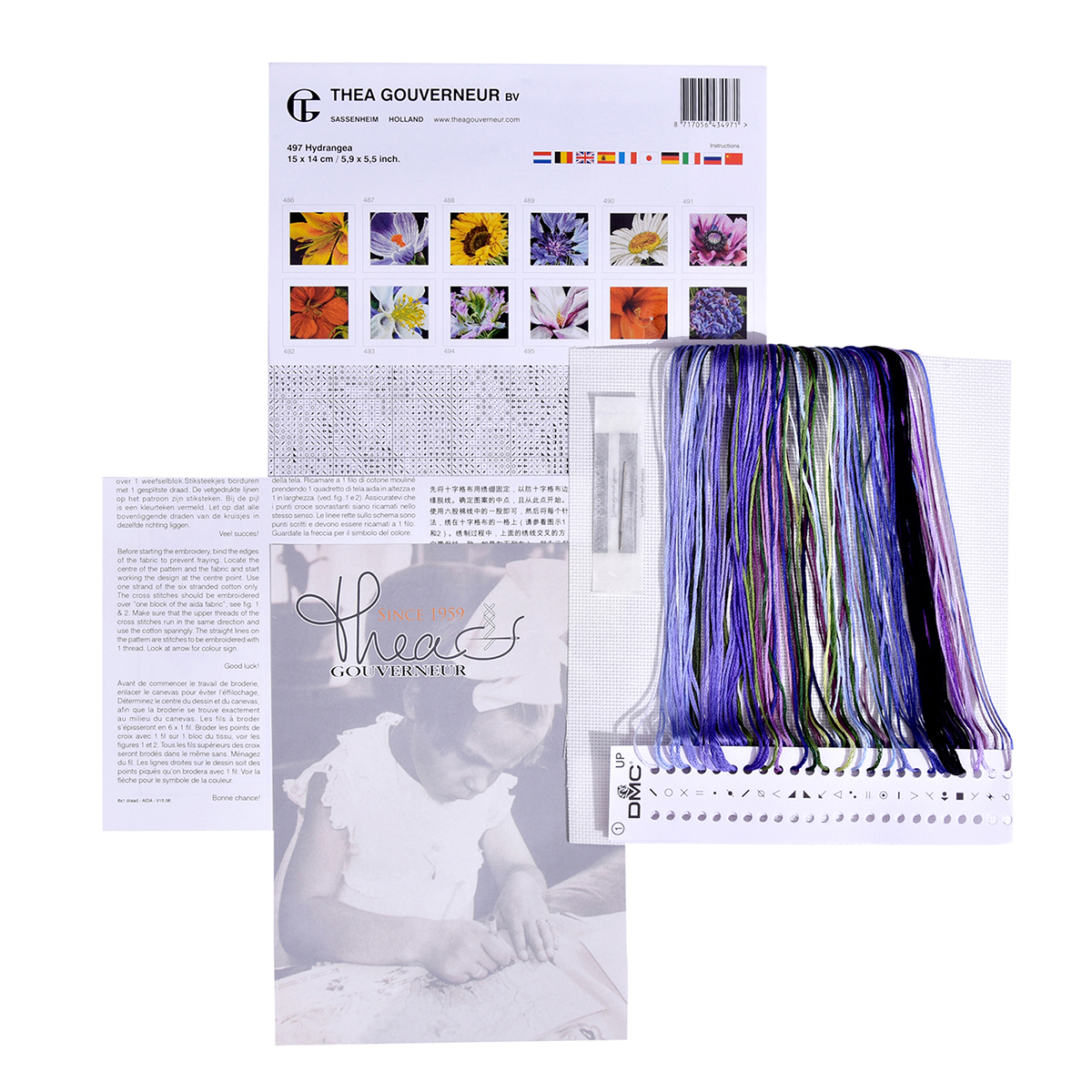 Наборы Thea Gouverneur укомплектованы качественными материалами, такими как мулине DMC из 100% хлопка и разные виды тканей для вышивания производства Zweigart. Наборы обозначенные буквой А после номера содержат в составе канву Aida, если в артикуле есть обозначение .05 – то этот набор укомплектован канвой Aida чёрного цвета. Также в ассортименте есть наборы на 100% льне и канве Jobelan. Черно-белые схемы тщательно прорабатываются вручную. Используется богатая цветовая палитра ниток, но в ассортименте компании есть и монохромные дизайны. Нитки разобраны по символам и закреплены на органайзере. Стрелка на бумажном органайзере указывает вверх, определяя правильность чтения символов.