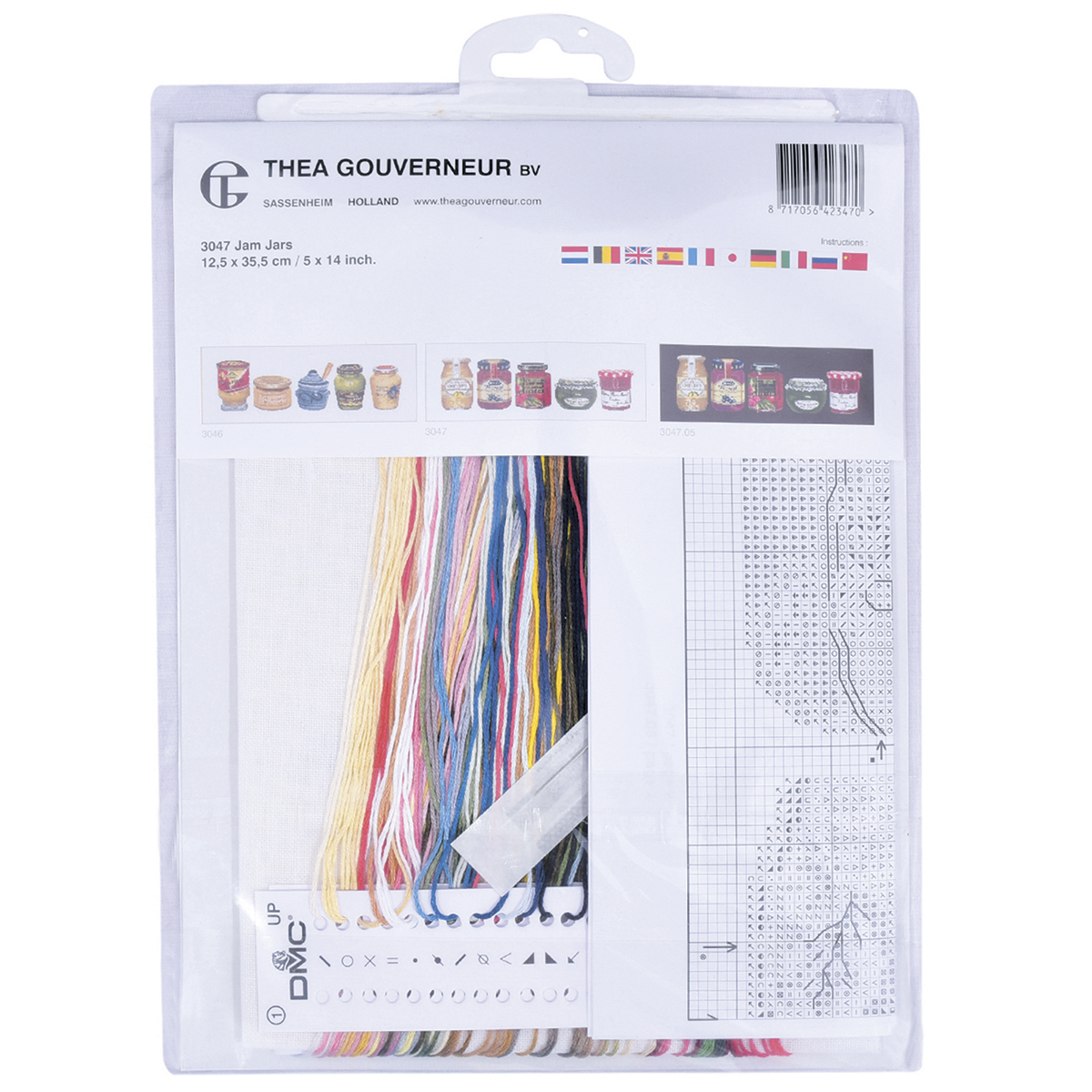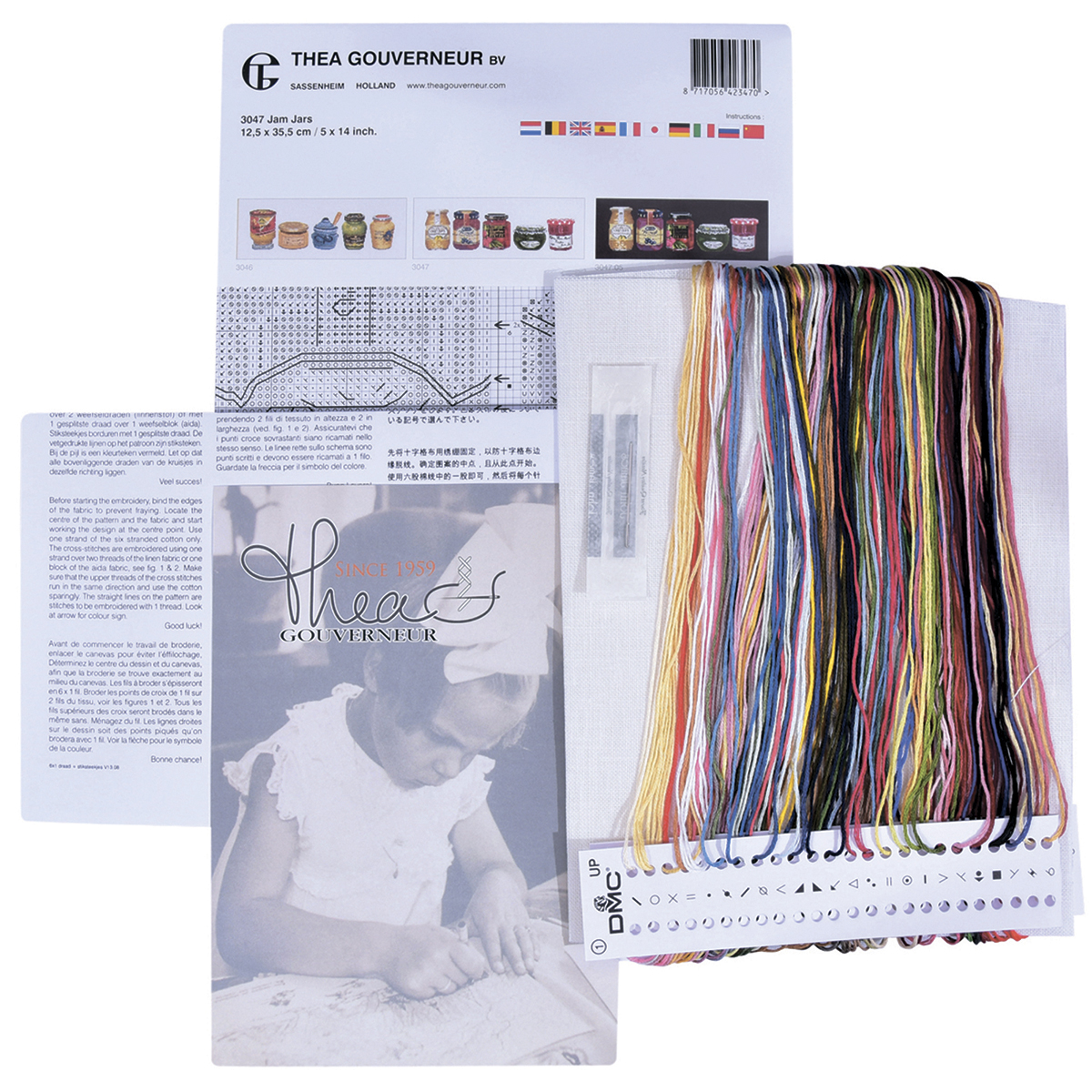 Наборы Thea Gouverneur укомплектованы качественными материалами, такими как мулине DMC из 100% хлопка и разные виды тканей для вышивания производства Zweigart. Наборы обозначенные буквой А после номера содержат в составе канву Aida, если в артикуле есть обозначение .05 – то этот набор укомплектован канвой Aida чёрного цвета. Также в ассортименте есть наборы на 100% льне и канве Jobelan. Черно-белые схемы тщательно прорабатываются вручную. Используется богатая цветовая палитра ниток, но в ассортименте компании есть и монохромные дизайны. Нитки разобраны по символам и закреплены на органайзере. Стрелка на бумажном органайзере указывает вверх, определяя правильность чтения символов.