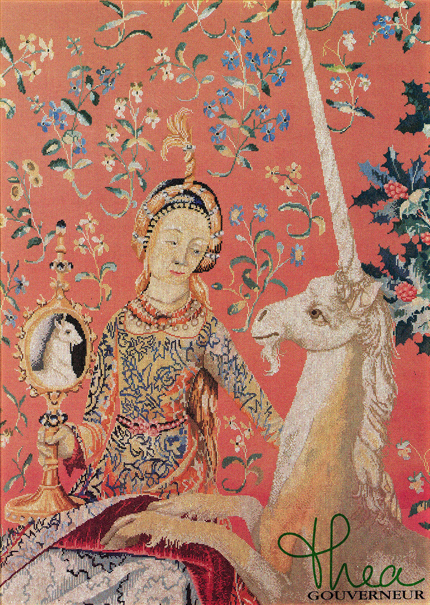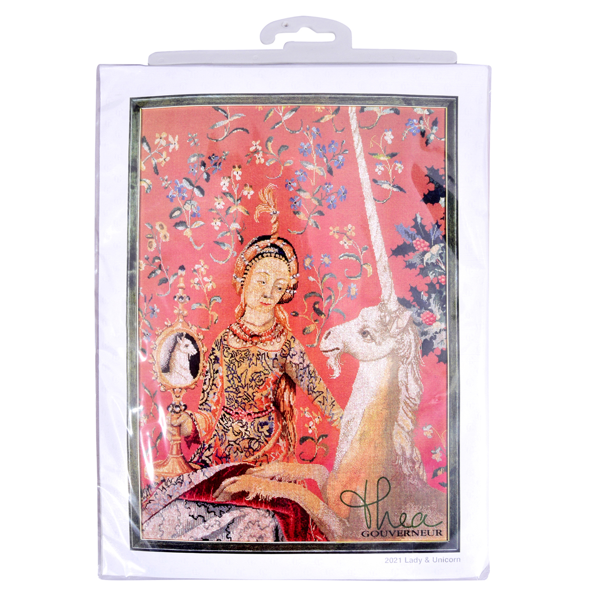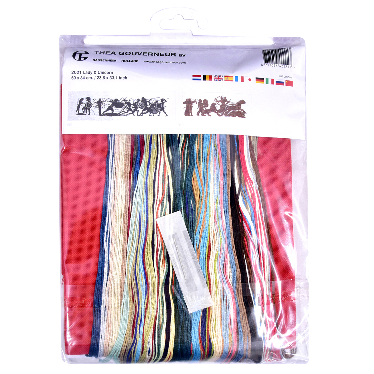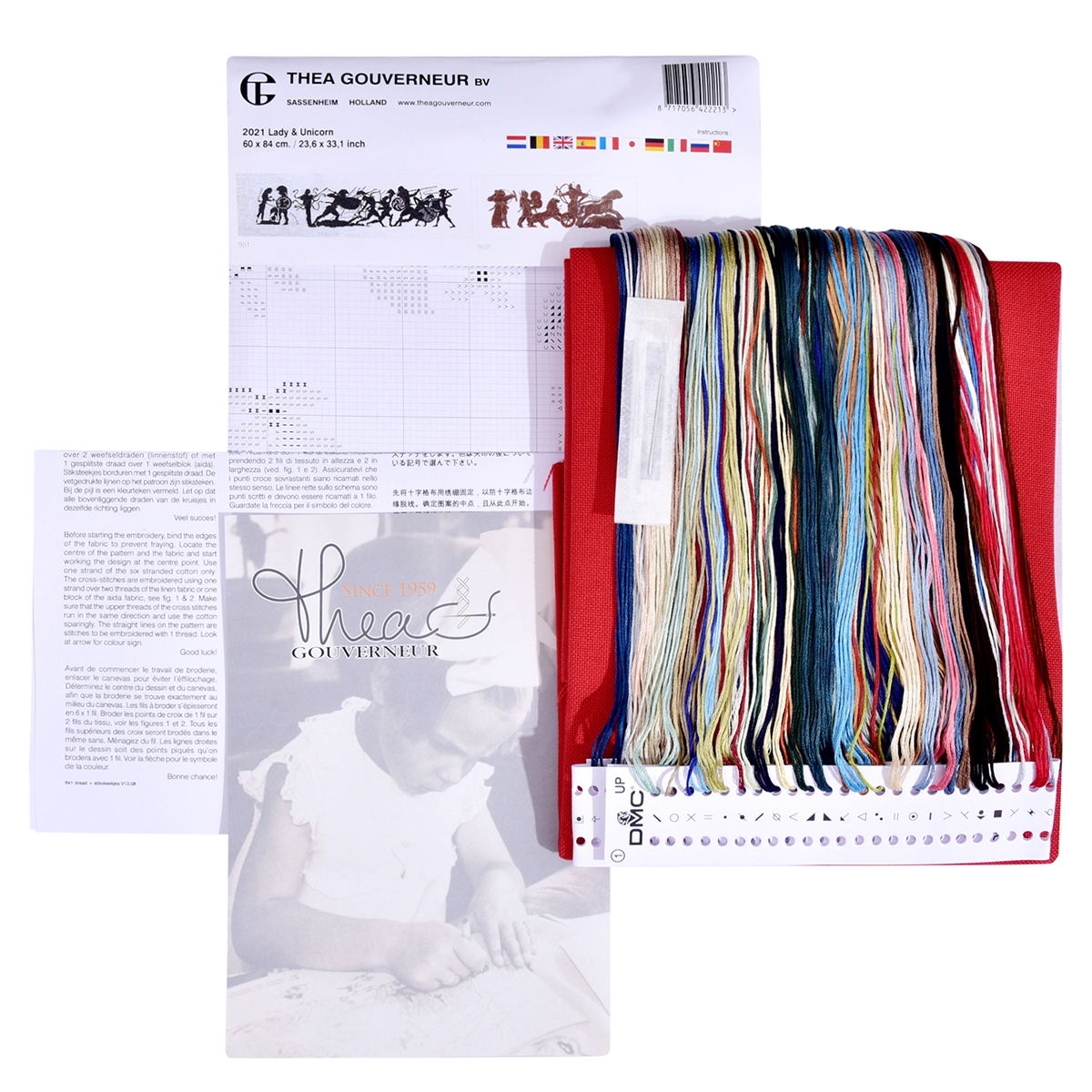 Наборы Thea Gouverneur укомплектованы качественными материалами, такими как мулине DMC из 100% хлопка и разные виды тканей для вышивания производства Zweigart. Наборы обозначенные буквой А после номера содержат в составе канву Aida, если в артикуле есть обозначение .05 – то этот набор укомплектован канвой Aida чёрного цвета. Также в ассортименте есть наборы на 100% льне и канве Jobelan. Черно-белые схемы тщательно прорабатываются вручную. Используется богатая цветовая палитра ниток, но в ассортименте компании есть и монохромные дизайны. Нитки разобраны по символам и закреплены на органайзере. Стрелка на бумажном органайзере указывает вверх, определяя правильность чтения символов.