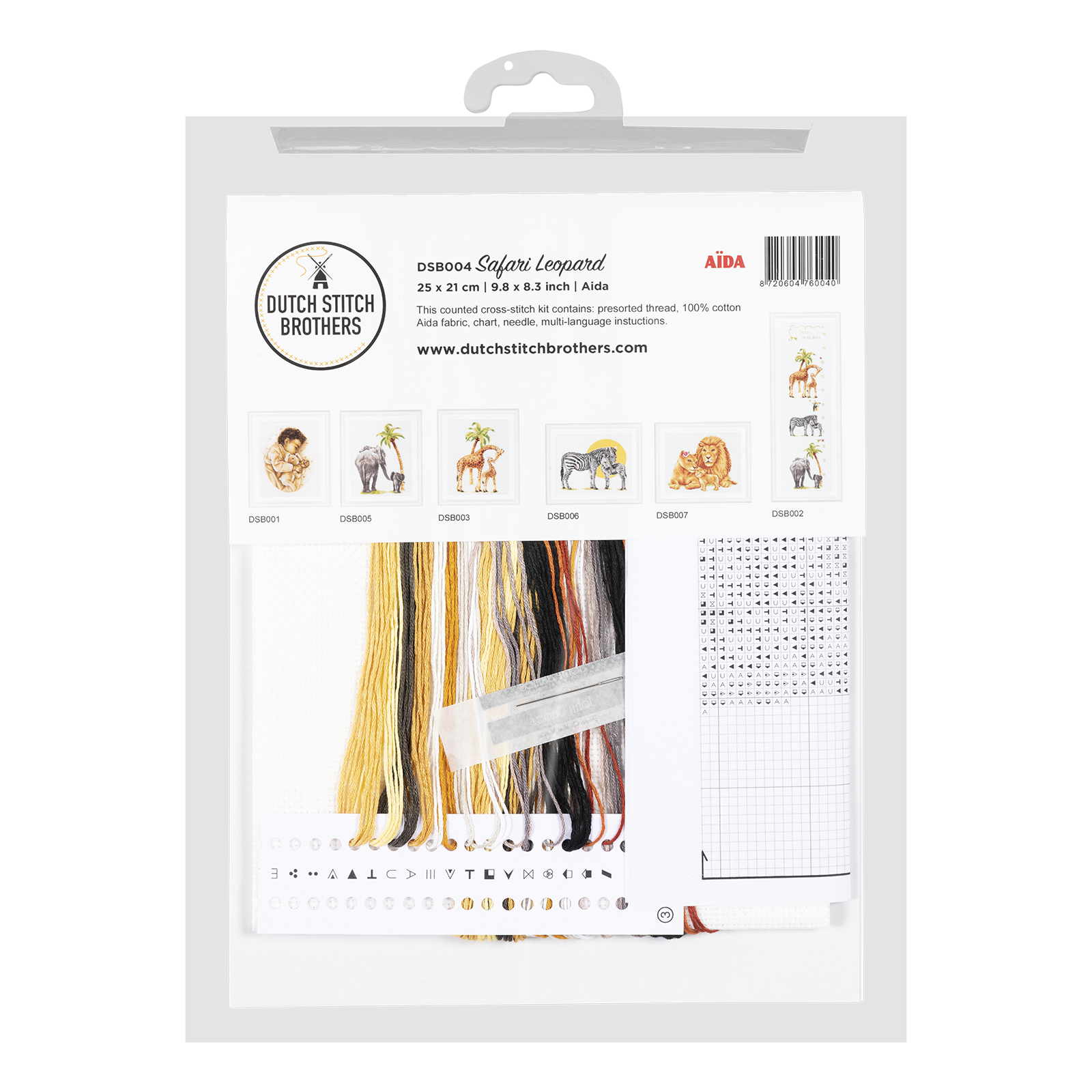 Наборы Dutch Stitch Brothers укомплектованы качественными материалами, такими как мулине DMC из 100% хлопка и разные виды тканей для вышивания производства Zweigart. Наборы обозначенные буквой А после номера содержат в составе канву Aida, если в артикуле есть обозначение .05 – то этот набор укомплектован канвой Aida чёрного цвета. Также в ассортименте есть наборы на 100% льне. Черно-белые схемы тщательно прорабатываются вручную. Используется богатая цветовая палитра ниток, но в ассортименте компании есть и монохромные дизайны. Нитки разобраны по символам и закреплены на органайзере. Стрелка на бумажном органайзере указывает вверх, определяя правильность чтения символов.