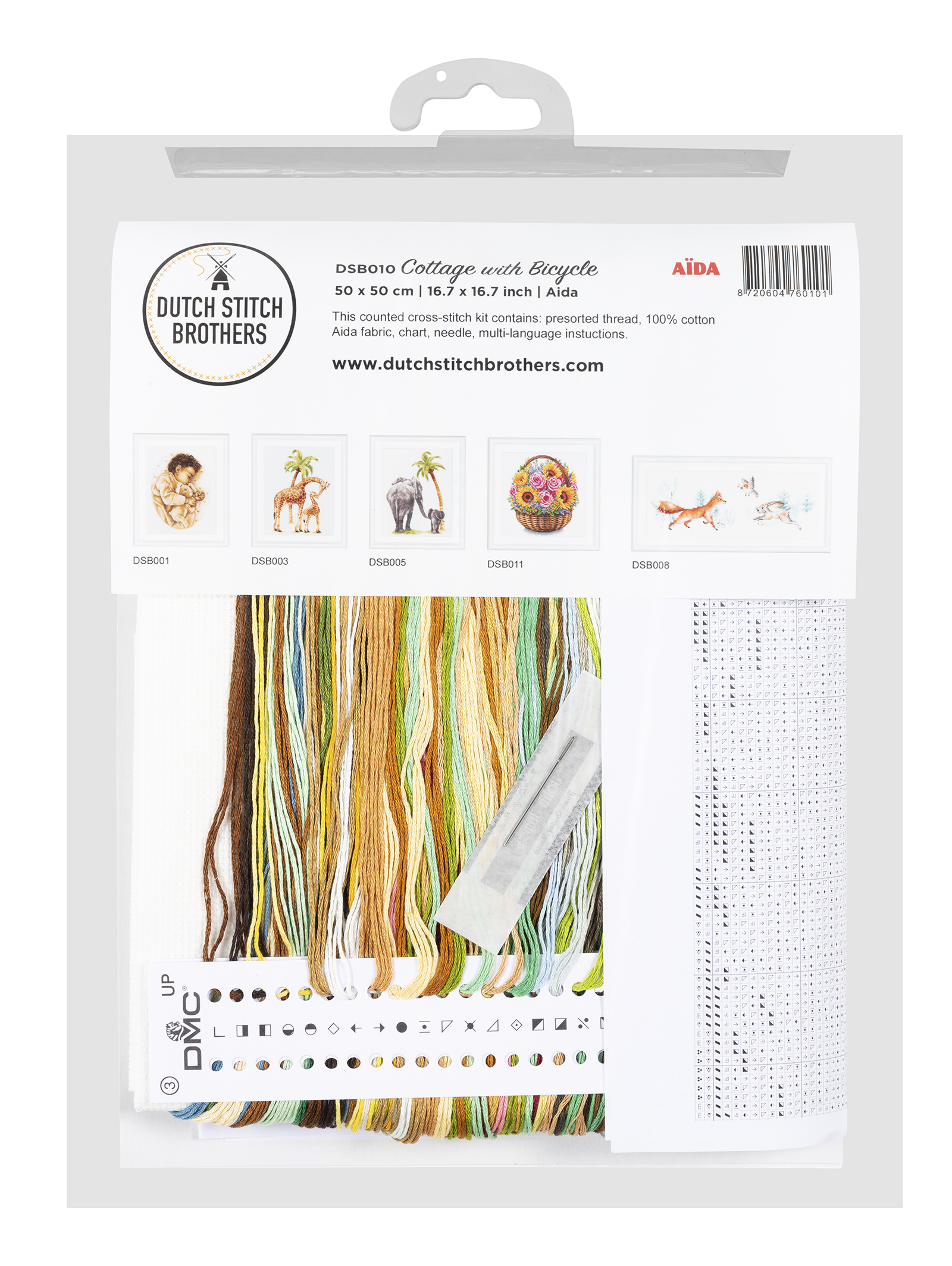 Наборы Dutch Stitch Brothers укомплектованы качественными материалами, такими как мулине DMC из 100% хлопка и разные виды тканей для вышивания производства Zweigart. Наборы обозначенные буквой А после номера содержат в составе канву Aida, если в артикуле есть обозначение .05 – то этот набор укомплектован канвой Aida чёрного цвета. Также в ассортименте есть наборы на 100% льне. Черно-белые схемы тщательно прорабатываются вручную. Используется богатая цветовая палитра ниток, но в ассортименте компании есть и монохромные дизайны. Нитки разобраны по символам и закреплены на органайзере. Стрелка на бумажном органайзере указывает вверх, определяя правильность чтения символов.