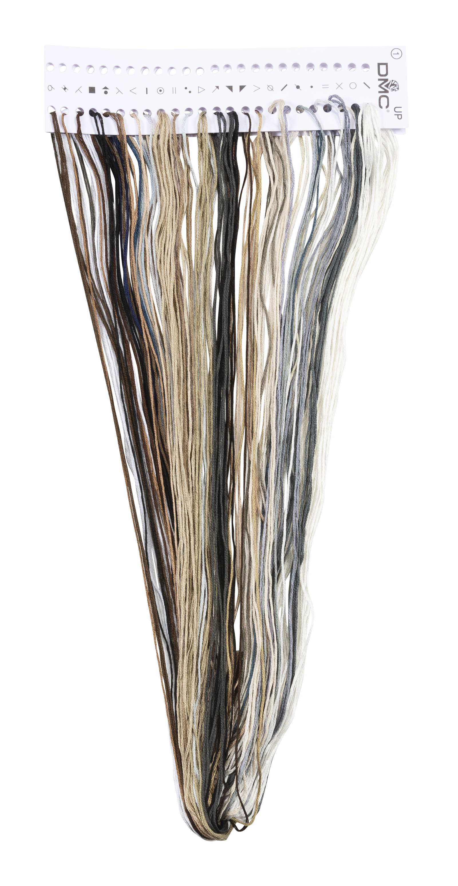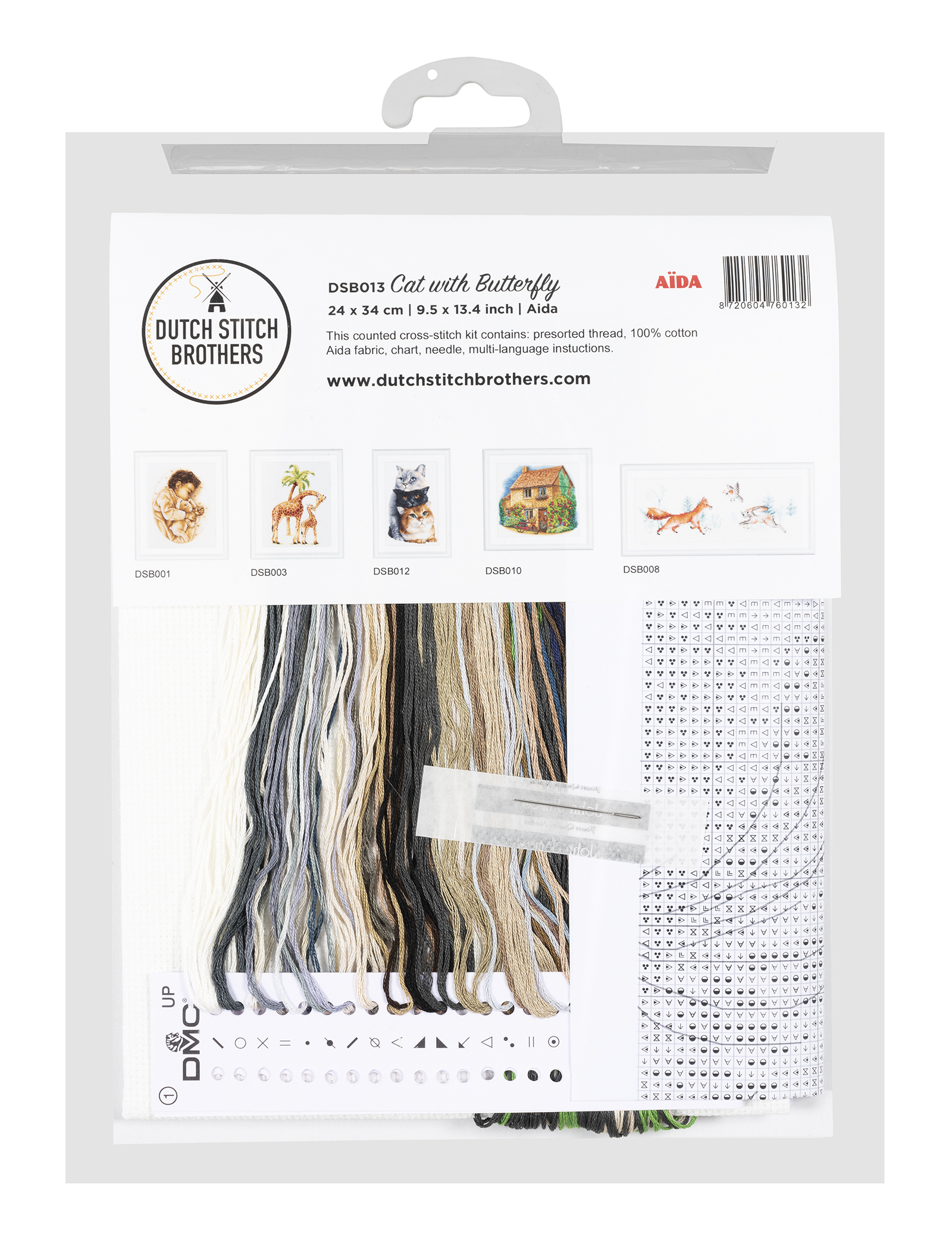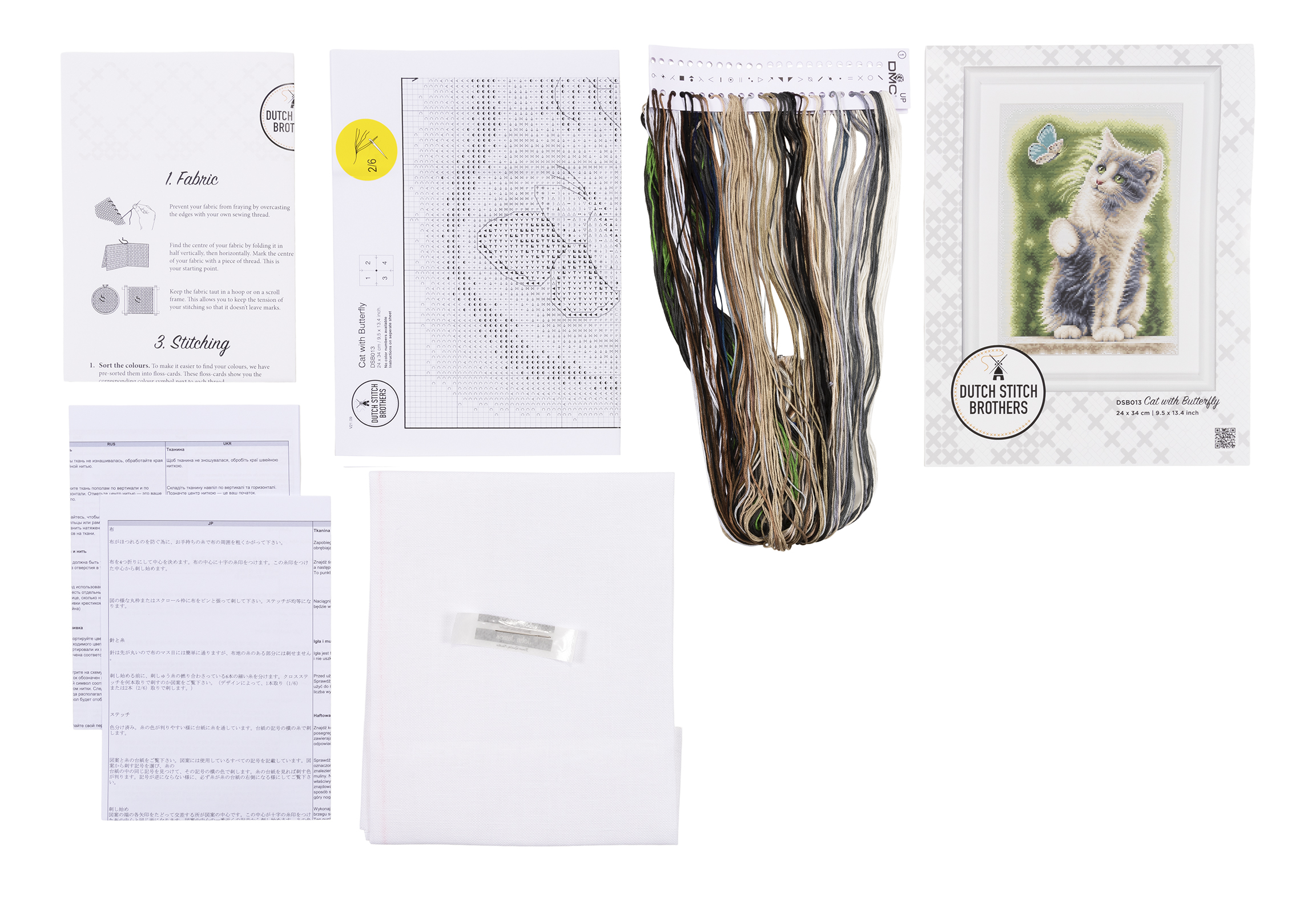 Наборы Dutch Stitch Brothers укомплектованы качественными материалами, такими как мулине DMC из 100% хлопка и разные виды тканей для вышивания производства Zweigart. Наборы обозначенные буквой А после номера содержат в составе канву Aida, если в артикуле есть обозначение .05 – то этот набор укомплектован канвой Aida чёрного цвета. Также в ассортименте есть наборы на 100% льне. Черно-белые схемы тщательно прорабатываются вручную. Используется богатая цветовая палитра ниток, но в ассортименте компании есть и монохромные дизайны. Нитки разобраны по символам и закреплены на органайзере. Стрелка на бумажном органайзере указывает вверх, определяя правильность чтения символов.