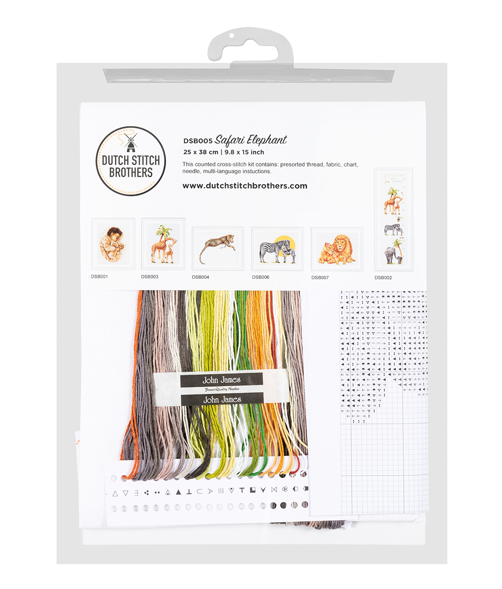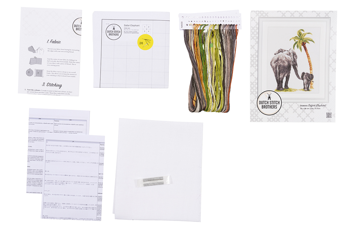 Наборы Dutch Stitch Brothers укомплектованы качественными материалами, такими как мулине DMC из 100% хлопка и разные виды тканей для вышивания производства Zweigart. Наборы обозначенные буквой А после номера содержат в составе канву Aida, если в артикуле есть обозначение .05 – то этот набор укомплектован канвой Aida чёрного цвета. Также в ассортименте есть наборы на 100% льне. Черно-белые схемы тщательно прорабатываются вручную. Используется богатая цветовая палитра ниток, но в ассортименте компании есть и монохромные дизайны. Нитки разобраны по символам и закреплены на органайзере. Стрелка на бумажном органайзере указывает вверх, определяя правильность чтения символов.