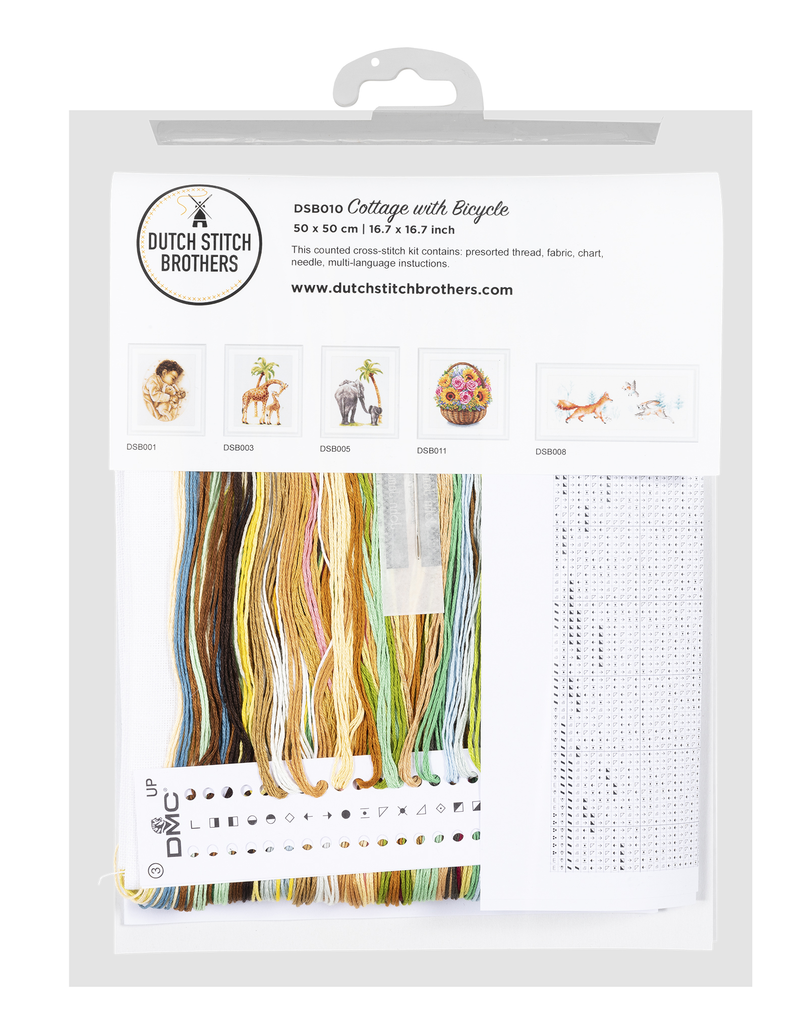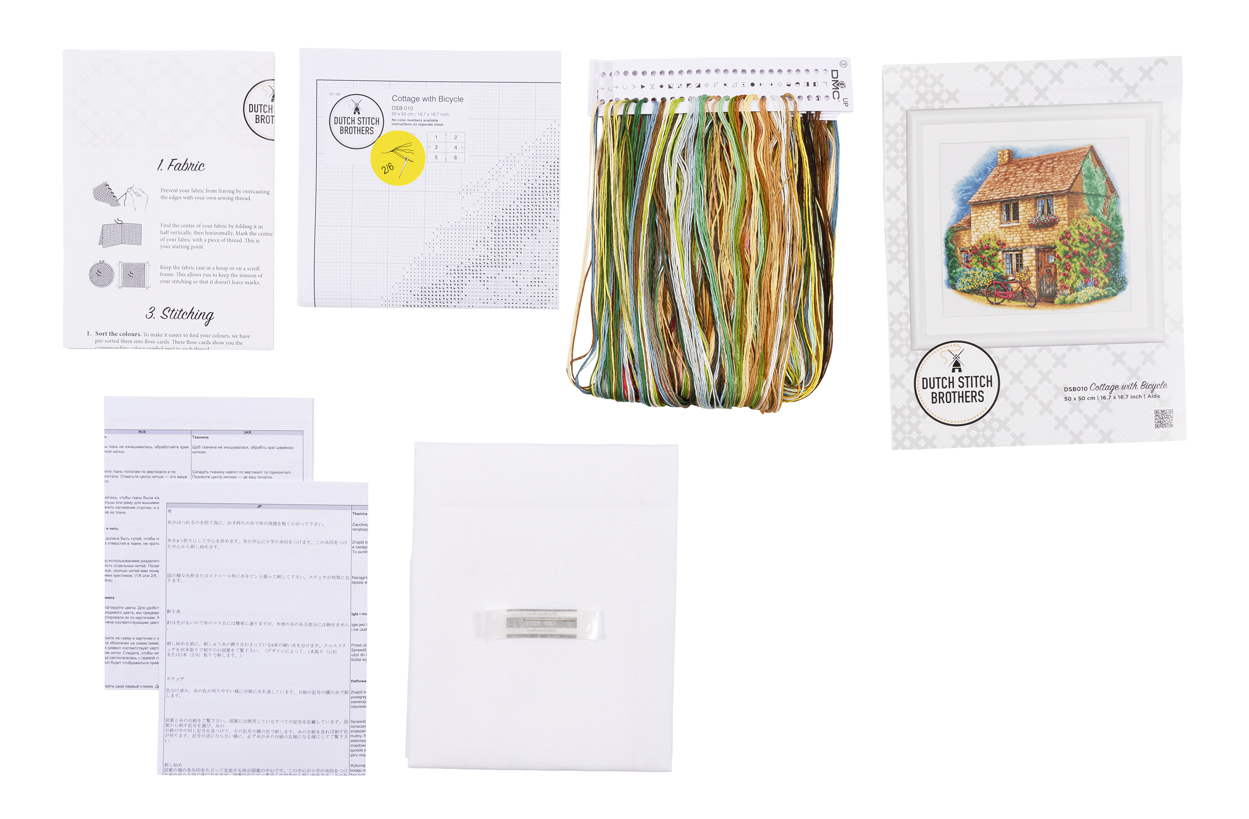Наборы Dutch Stitch Brothers укомплектованы качественными материалами, такими как мулине DMC из 100% хлопка и разные виды тканей для вышивания производства Zweigart. Наборы обозначенные буквой А после номера содержат в составе канву Aida, если в артикуле есть обозначение .05 – то этот набор укомплектован канвой Aida чёрного цвета. Также в ассортименте есть наборы на 100% льне. Черно-белые схемы тщательно прорабатываются вручную. Используется богатая цветовая палитра ниток, но в ассортименте компании есть и монохромные дизайны. Нитки разобраны по символам и закреплены на органайзере. Стрелка на бумажном органайзере указывает вверх, определяя правильность чтения символов.