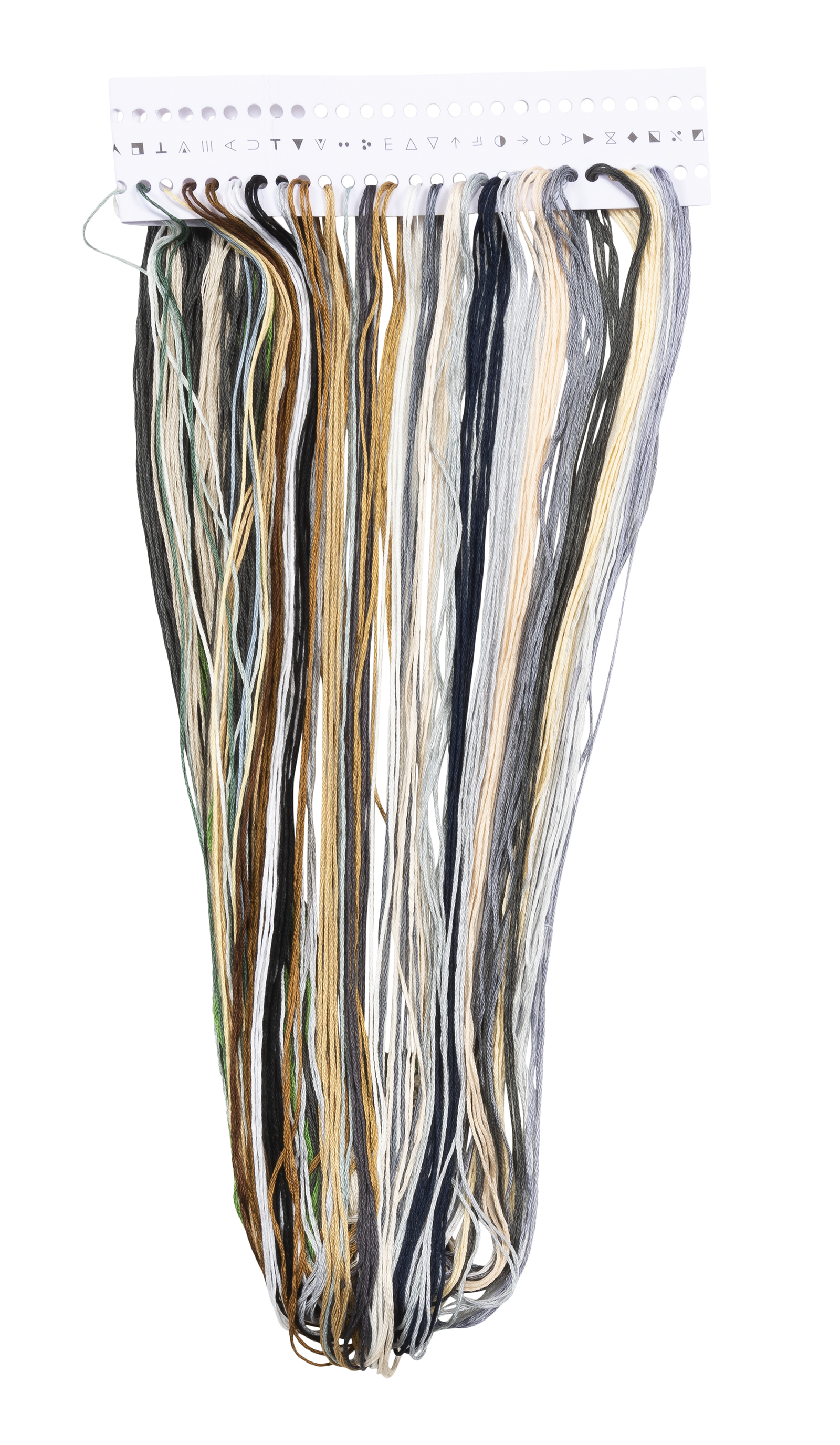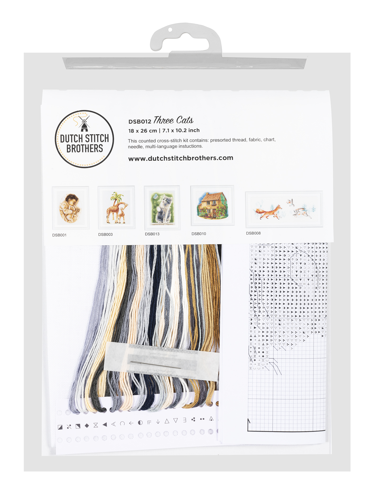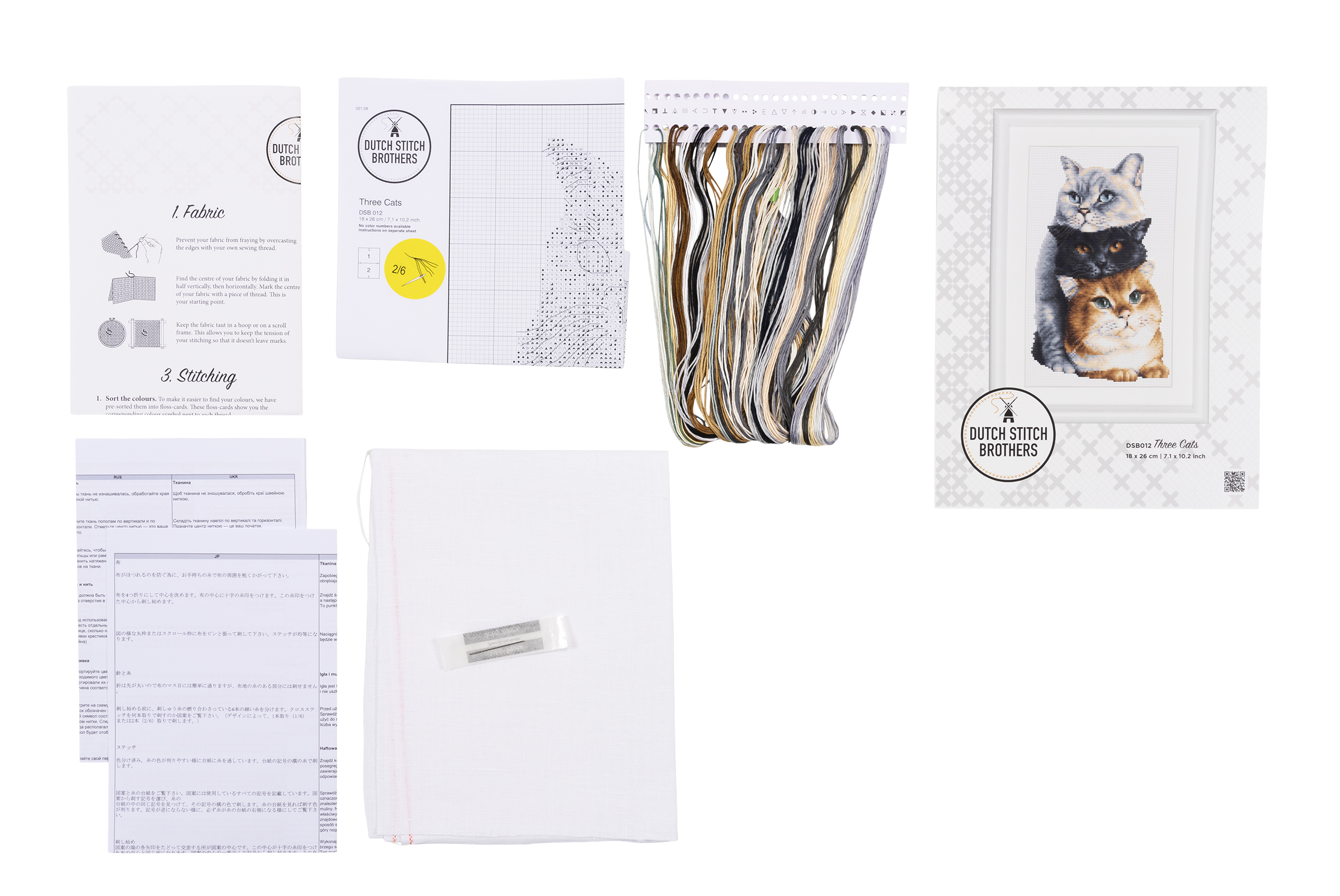 Наборы Dutch Stitch Brothers укомплектованы качественными материалами, такими как мулине DMC из 100% хлопка и разные виды тканей для вышивания производства Zweigart. Наборы обозначенные буквой А после номера содержат в составе канву Aida, если в артикуле есть обозначение .05 – то этот набор укомплектован канвой Aida чёрного цвета. Также в ассортименте есть наборы на 100% льне. Черно-белые схемы тщательно прорабатываются вручную. Используется богатая цветовая палитра ниток, но в ассортименте компании есть и монохромные дизайны. Нитки разобраны по символам и закреплены на органайзере. Стрелка на бумажном органайзере указывает вверх, определяя правильность чтения символов.