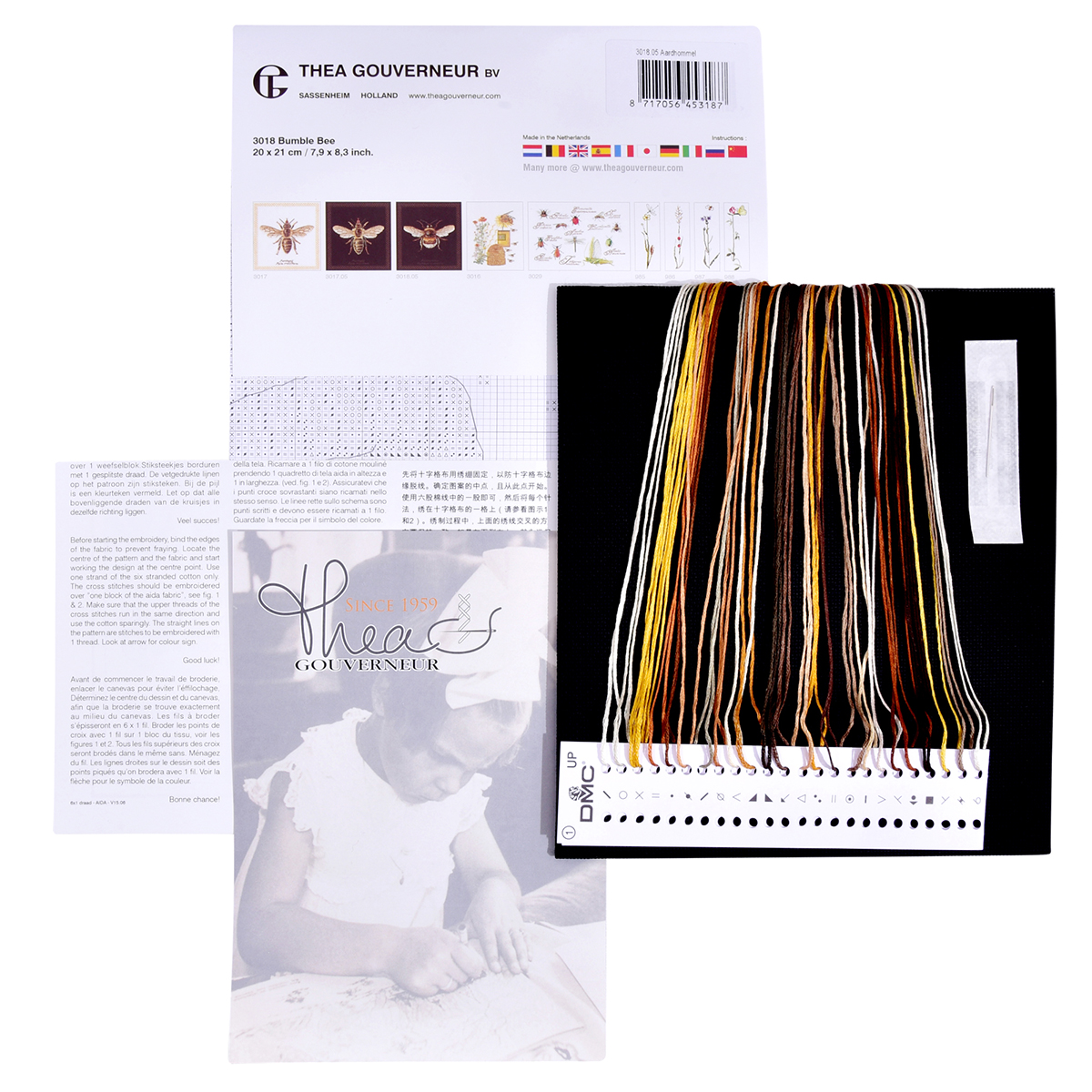 Наборы Thea Gouverneur укомплектованы качественными материалами, такими как мулине DMC из 100% хлопка и разные виды тканей для вышивания производства Zweigart. Наборы обозначенные буквой А после номера содержат в составе канву Aida, если в артикуле есть обозначение .05 – то этот набор укомплектован канвой Aida чёрного цвета. Также в ассортименте есть наборы на 100% льне и канве Jobelan. Черно-белые схемы тщательно прорабатываются вручную. Используется богатая цветовая палитра ниток, но в ассортименте компании есть и монохромные дизайны. Нитки разобраны по символам и закреплены на органайзере. Стрелка на бумажном органайзере указывает вверх, определяя правильность чтения символов.