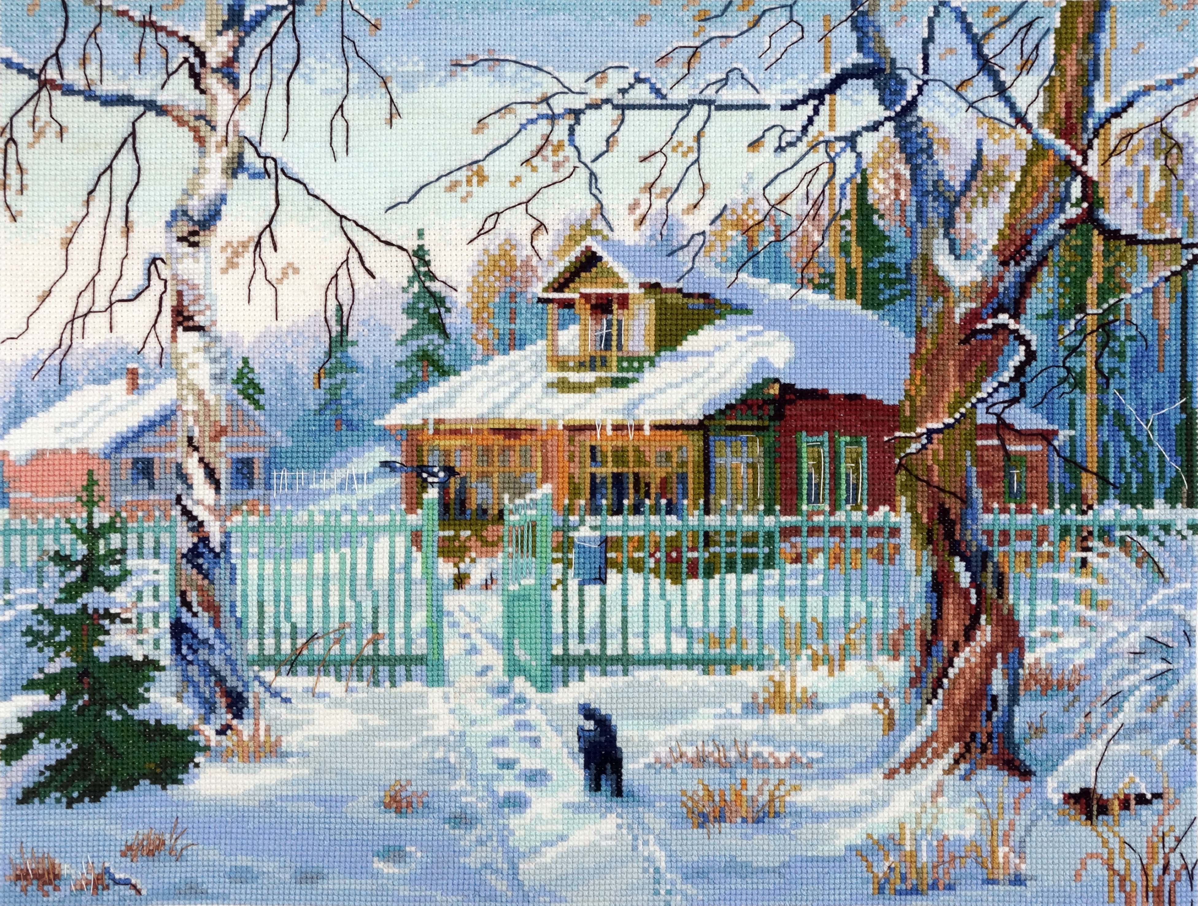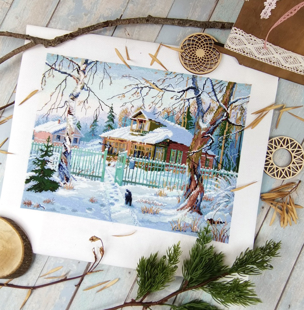 Атмосферный дизайн, который понравится ценителям красоты родного края и зимних пейзажей. Бревенчатый дом с яркими наличниками на окнах и залитой солнцем террасой словно укутан большими, отливающими синевой сугробами снега, накиданными последними февральскими снегопадами. Дорожка припорошена метелью, но по тому, как ярко пригревает солнце, и блестят сосульки на крыше, чувствуется неодолимое приближение весны.