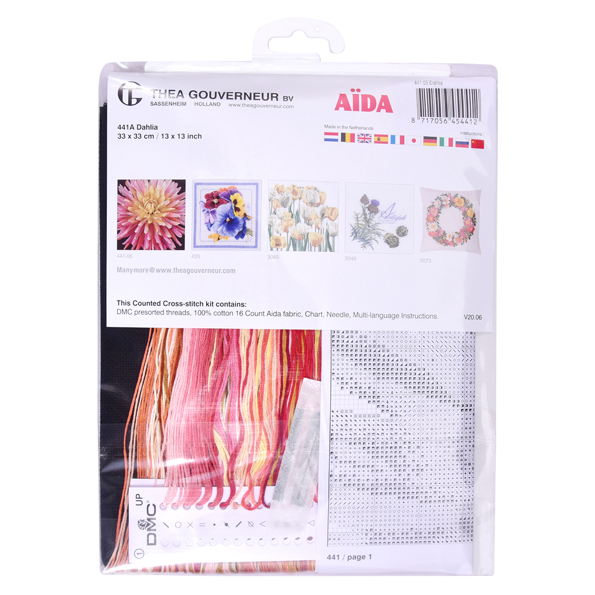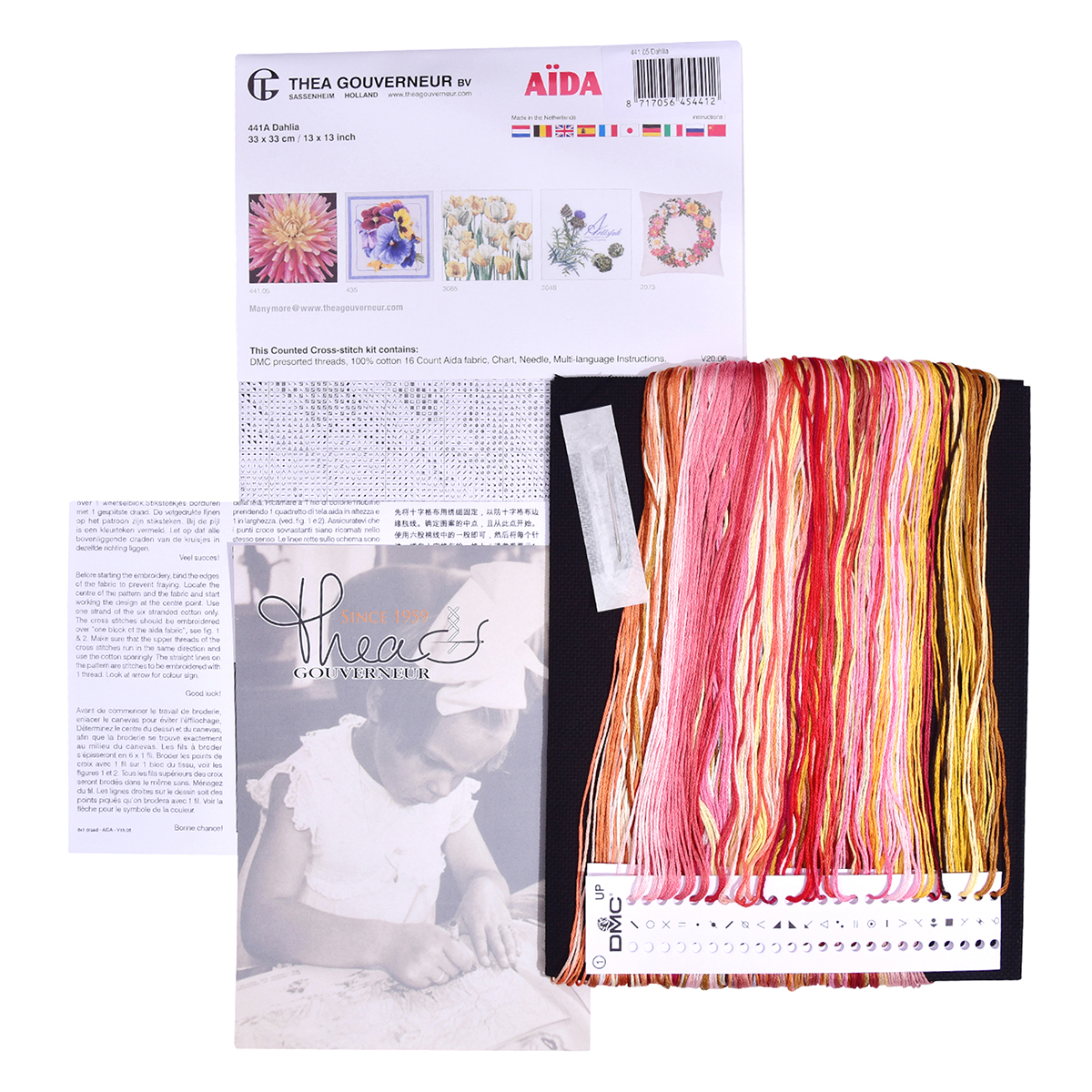 Наборы Thea Gouverneur укомплектованы качественными материалами, такими как мулине DMC из 100% хлопка и разные виды тканей для вышивания производства Zweigart. Наборы обозначенные буквой А после номера содержат в составе канву Aida, если в артикуле есть обозначение .05 – то этот набор укомплектован канвой Aida чёрного цвета. Также в ассортименте есть наборы на 100% льне и канве Jobelan. Черно-белые схемы тщательно прорабатываются вручную. Используется богатая цветовая палитра ниток, но в ассортименте компании есть и монохромные дизайны. Нитки разобраны по символам и закреплены на органайзере. Стрелка на бумажном органайзере указывает вверх, определяя правильность чтения символов.