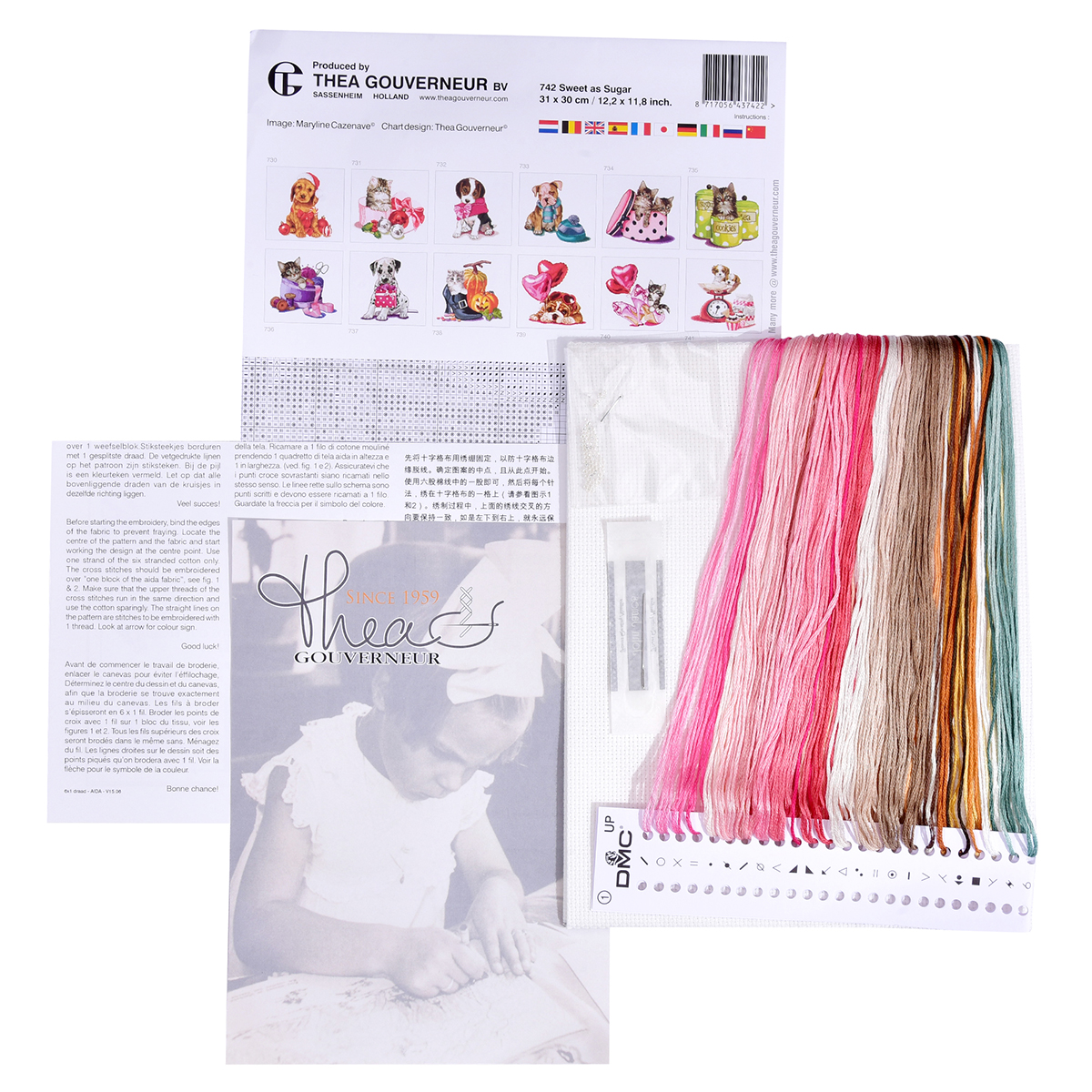 Наборы Thea Gouverneur укомплектованы качественными материалами, такими как мулине DMC из 100% хлопка и разные виды тканей для вышивания производства Zweigart. Наборы обозначенные буквой А после номера содержат в составе канву Aida, если в артикуле есть обозначение .05 – то этот набор укомплектован канвой Aida чёрного цвета. Также в ассортименте есть наборы на 100% льне и канве Jobelan. Черно-белые схемы тщательно прорабатываются вручную. Используется богатая цветовая палитра ниток, но в ассортименте компании есть и монохромные дизайны. Нитки разобраны по символам и закреплены на органайзере. Стрелка на бумажном органайзере указывает вверх, определяя правильность чтения символов.