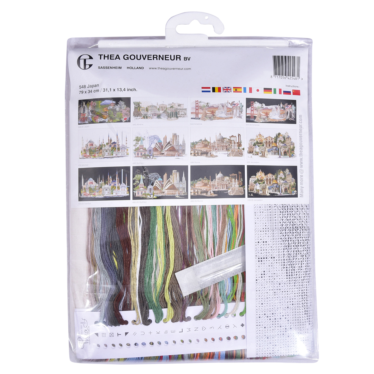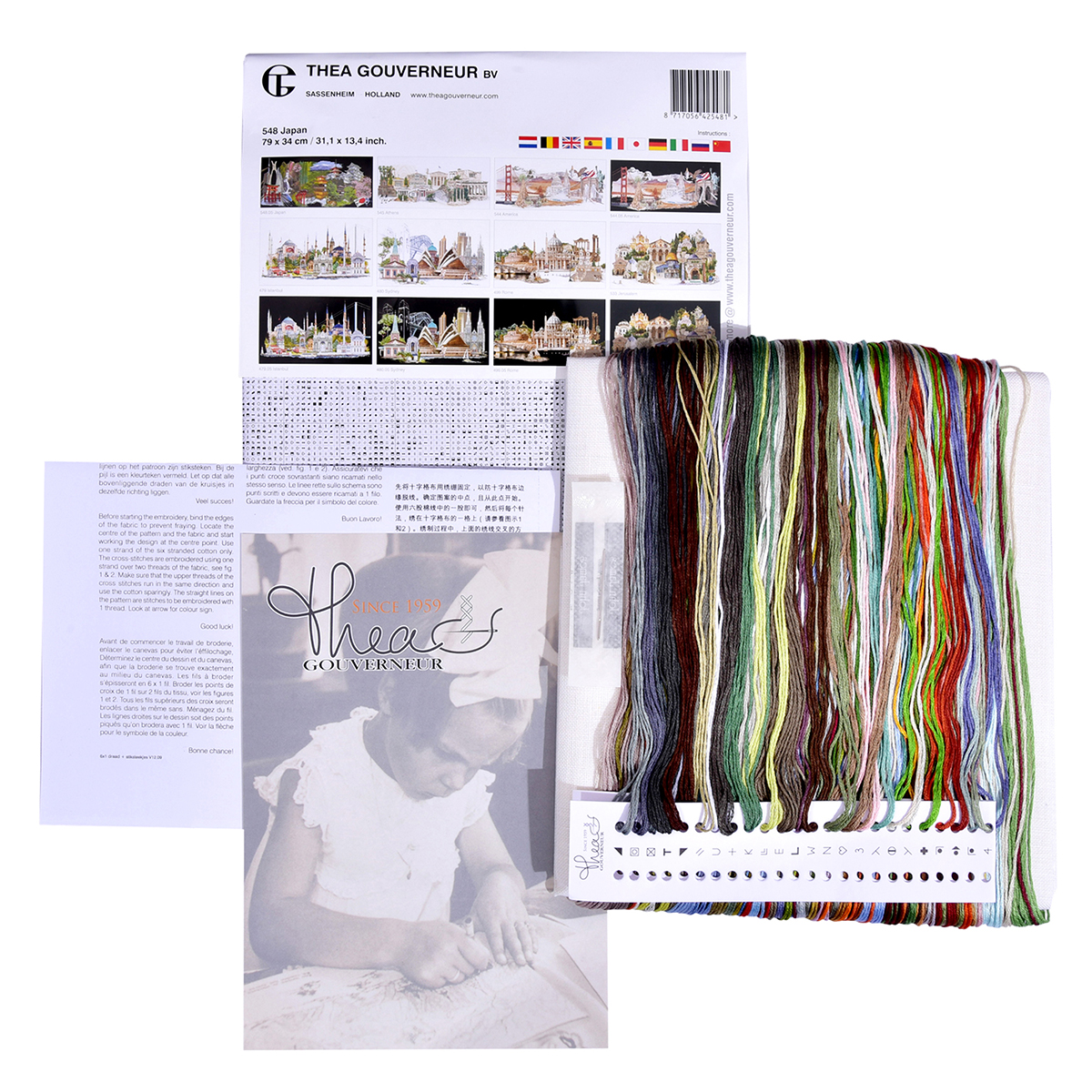 Наборы Thea Gouverneur укомплектованы качественными материалами, такими как мулине DMC из 100% хлопка и разные виды тканей для вышивания производства Zweigart. Наборы обозначенные буквой А после номера содержат в составе канву Aida, если в артикуле есть обозначение .05 – то этот набор укомплектован канвой Aida чёрного цвета. Также в ассортименте есть наборы на 100% льне и канве Jobelan. Черно-белые схемы тщательно прорабатываются вручную. Используется богатая цветовая палитра ниток, но в ассортименте компании есть и монохромные дизайны. Нитки разобраны по символам и закреплены на органайзере. Стрелка на бумажном органайзере указывает вверх, определяя правильность чтения символов.