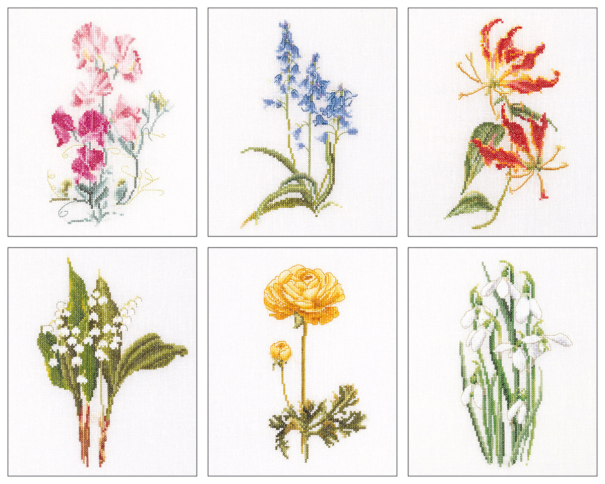 Наборы Thea Gouverneur укомплектованы качественными материалами, такими как мулине DMC из 100% хлопка и разные виды тканей для вышивания производства Zweigart. Наборы обозначенные буквой А после номера содержат в составе канву Aida, если в артикуле есть обозначение .05 – то этот набор укомплектован канвой Aida чёрного цвета. Также в ассортименте есть наборы на 100% льне и канве Jobelan. Черно-белые схемы тщательно прорабатываются вручную. Используется богатая цветовая палитра ниток, но в ассортименте компании есть и монохромные дизайны. Нитки разобраны по символам и закреплены на органайзере. Стрелка на бумажном органайзере указывает вверх, определяя правильность чтения символов.