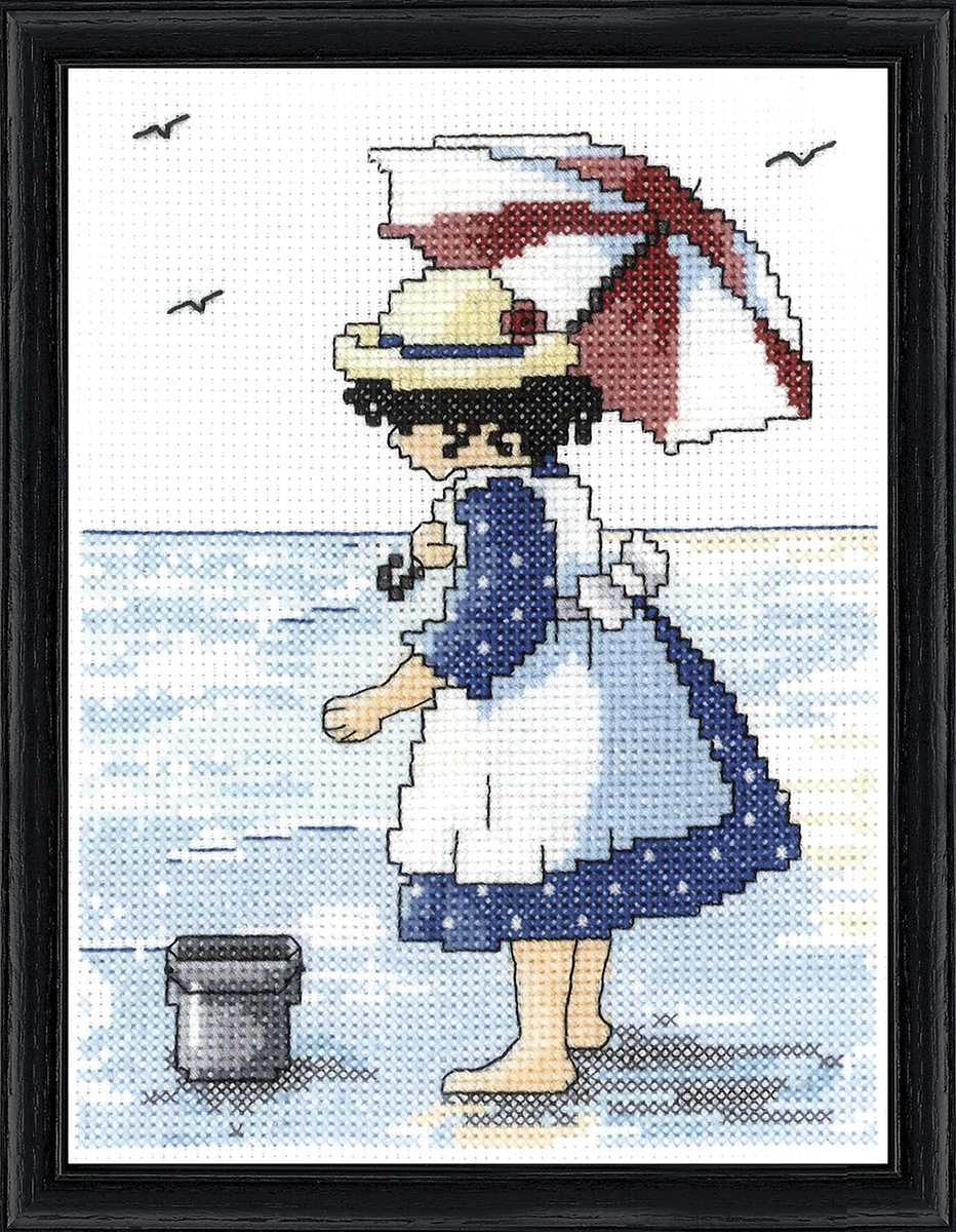 Очаровательная маленькая девочка, стоящая на пляже и собирающая ракушки. Отлично подходит для любой комнаты для маленьких девочек или даже детской.