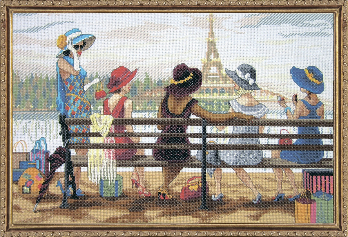 5 прекрасных дам, отдыхающих после целого дня шопинга с прекрасным видом на Эйфелеву башню в Париже. Прекрасный пейзаж с потрясающими цветами и шикарным дизайном. Вышивайте с удовольствием!!!