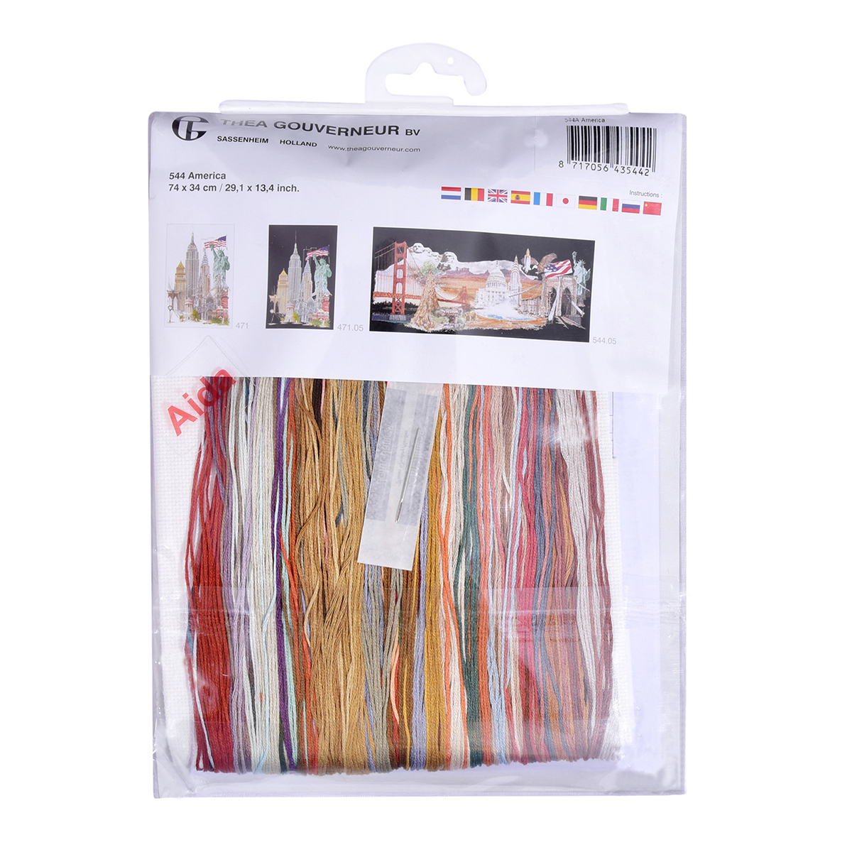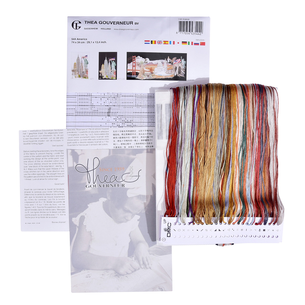 Наборы Thea Gouverneur укомплектованы качественными материалами, такими как мулине DMC из 100% хлопка и разные виды тканей для вышивания производства Zweigart. Наборы обозначенные буквой А после номера содержат в составе канву Aida, если в артикуле есть обозначение .05 – то этот набор укомплектован канвой Aida чёрного цвета. Также в ассортименте есть наборы на 100% льне и канве Jobelan. Черно-белые схемы тщательно прорабатываются вручную. Используется богатая цветовая палитра ниток, но в ассортименте компании есть и монохромные дизайны. Нитки разобраны по символам и закреплены на органайзере. Стрелка на бумажном органайзере указывает вверх, определяя правильность чтения символов.