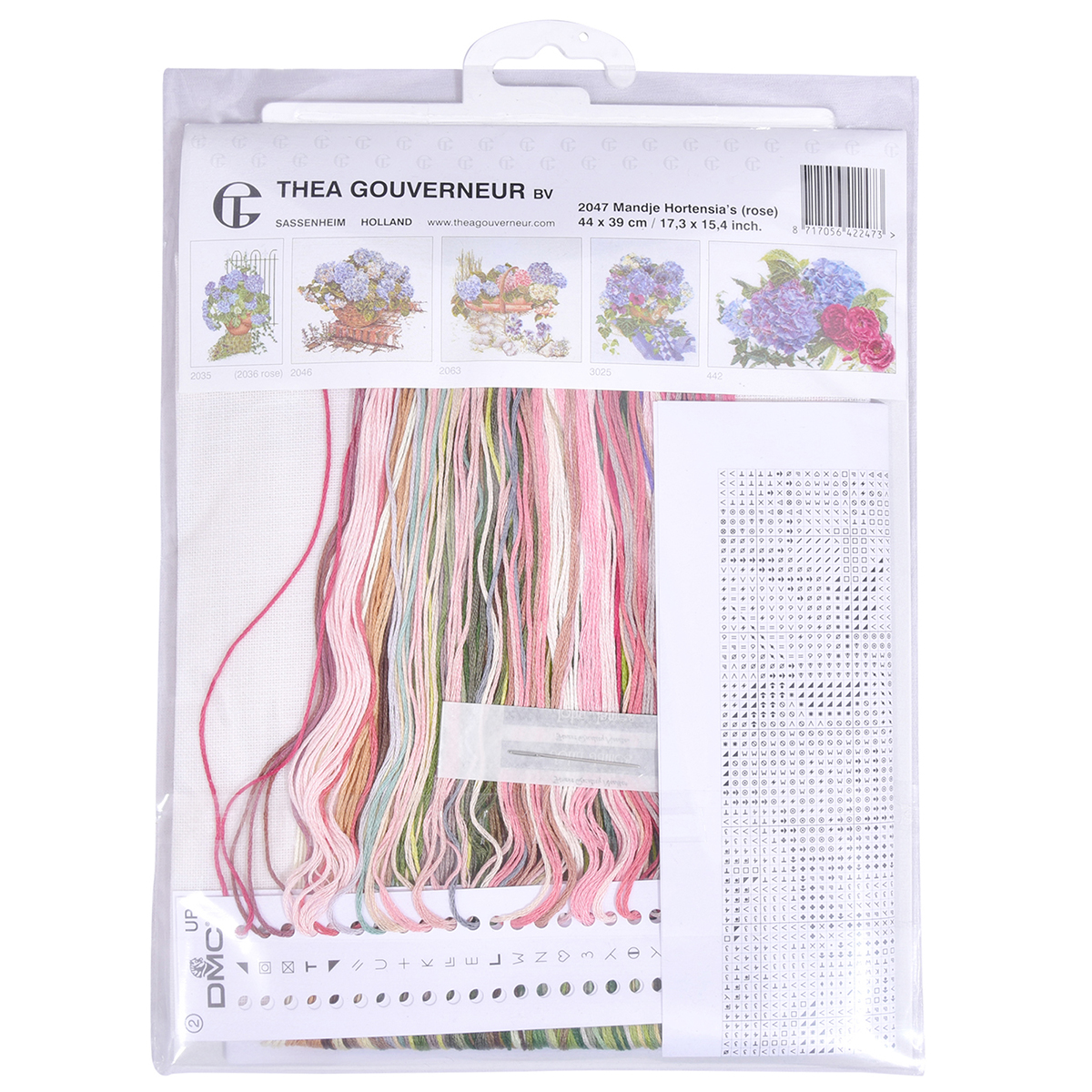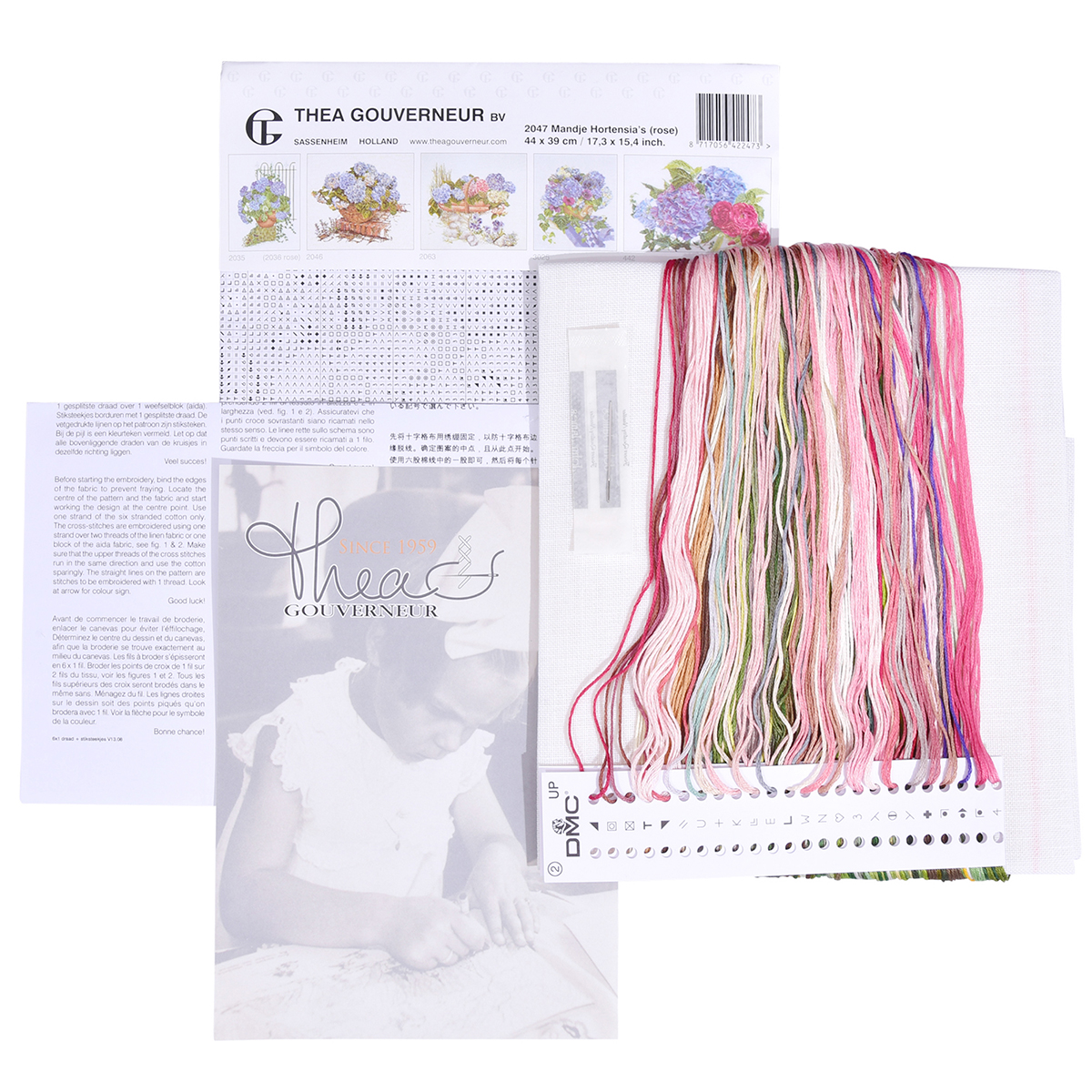 Наборы Thea Gouverneur укомплектованы качественными материалами, такими как мулине DMC из 100% хлопка и разные виды тканей для вышивания производства Zweigart. Наборы обозначенные буквой А после номера содержат в составе канву Aida, если в артикуле есть обозначение .05 – то этот набор укомплектован канвой Aida чёрного цвета. Также в ассортименте есть наборы на 100% льне и канве Jobelan. Черно-белые схемы тщательно прорабатываются вручную. Используется богатая цветовая палитра ниток, но в ассортименте компании есть и монохромные дизайны. Нитки разобраны по символам и закреплены на органайзере. Стрелка на бумажном органайзере указывает вверх, определяя правильность чтения символов.