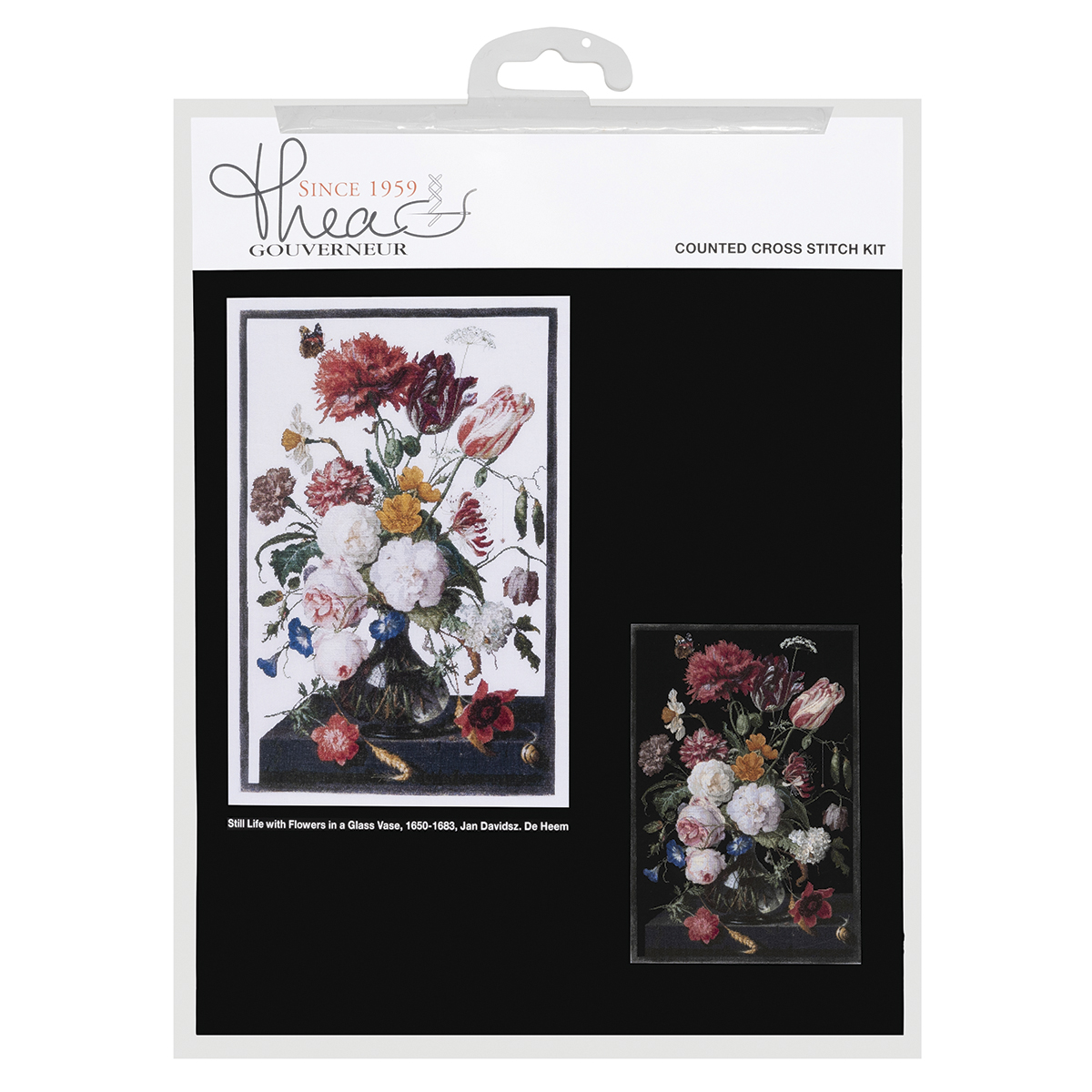 Наборы Thea Gouverneur укомплектованы качественными материалами, такими как мулине DMC из 100% хлопка и разные виды тканей для вышивания производства Zweigart. Наборы обозначенные буквой А после номера содержат в составе канву Aida, если в артикуле есть обозначение .05 – то этот набор укомплектован канвой Aida чёрного цвета. Также в ассортименте есть наборы на 100% льне и канве Jobelan. Черно-белые схемы тщательно прорабатываются вручную. Используется богатая цветовая палитра ниток, но в ассортименте компании есть и монохромные дизайны. Нитки разобраны по символам и закреплены на органайзере. Стрелка на бумажном органайзере указывает вверх, определяя правильность чтения символов.