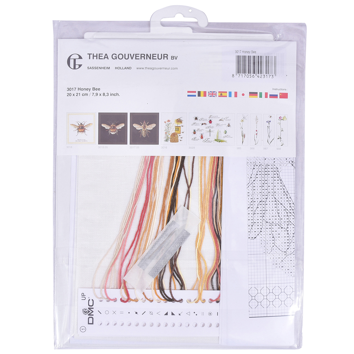 Наборы Thea Gouverneur укомплектованы качественными материалами, такими как мулине DMC из 100% хлопка и разные виды тканей для вышивания производства Zweigart. Наборы обозначенные буквой А после номера содержат в составе канву Aida, если в артикуле есть обозначение .05 – то этот набор укомплектован канвой Aida чёрного цвета. Также в ассортименте есть наборы на 100% льне и канве Jobelan. Черно-белые схемы тщательно прорабатываются вручную. Используется богатая цветовая палитра ниток, но в ассортименте компании есть и монохромные дизайны. Нитки разобраны по символам и закреплены на органайзере. Стрелка на бумажном органайзере указывает вверх, определяя правильность чтения символов.