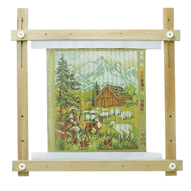 Рамка для вышивания гобеленов, плоская, материал – полированный бук, регулируемый размер, с тканой лентой для крепления гобеленов.
