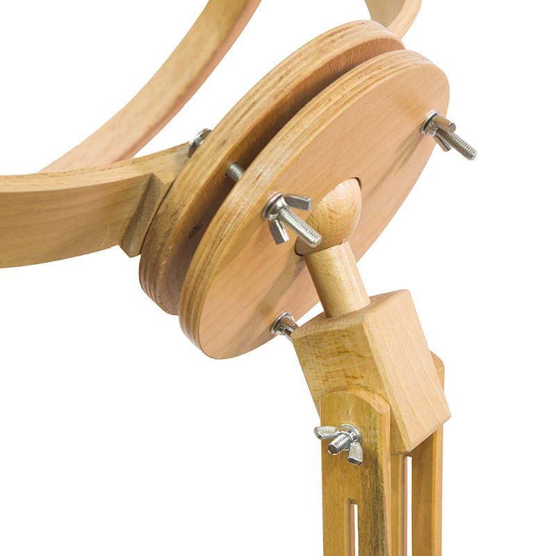 Профессиональная напольная подставка с поворотными пяльцам. Материал – лакированный бук, квадратные пяльцы со скругленными углами 450 х 450 мм, с высотой колец 24 мм, регулировочный винт с гайкой-барашком, пяльца вращаются на 360°, стойка с плоским овальным основанием из массива бука, регулируемая высота и угол наклона пялец, общая регулируемая высота 75 – 95 см.