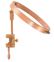 Пяльцы для вышивания с креплением к столу, возможная толщина столешницы до 35 мм, материал – бук, тройная склейка, полированные с защитным лаком, бронзовые стягивающие винты, регулировка по высоте и углу наклона.