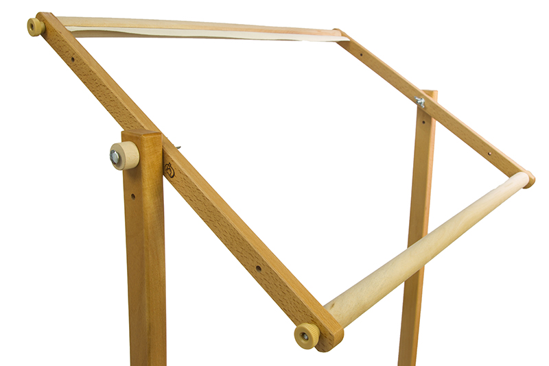 Напольная рамка для вышивания гобеленов, крутящиеся стержни с тканой лентой для крепления гобеленов, материал – полированный бук, регулируемый угол наклона и высота, общая высота 92 см.