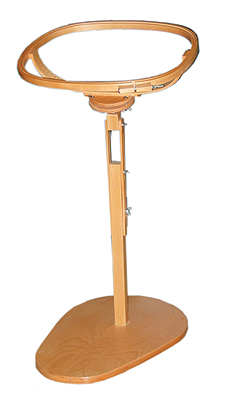 Профессиональная напольная подставка с поворотными пяльцами. Материал – лакированный бук, прямоугольные пяльцы со скругленными углами 536 х 636 мм, с высотой колец 24 мм, регулировочный винт с гайкой-барашком, пяльца вращаются на 360°, стойка с плоским овальным основанием из массива бука, регулируемая высота и угол наклона пялец, общая регулируемая высота 75 – 95 см.