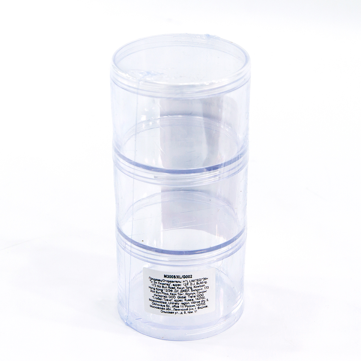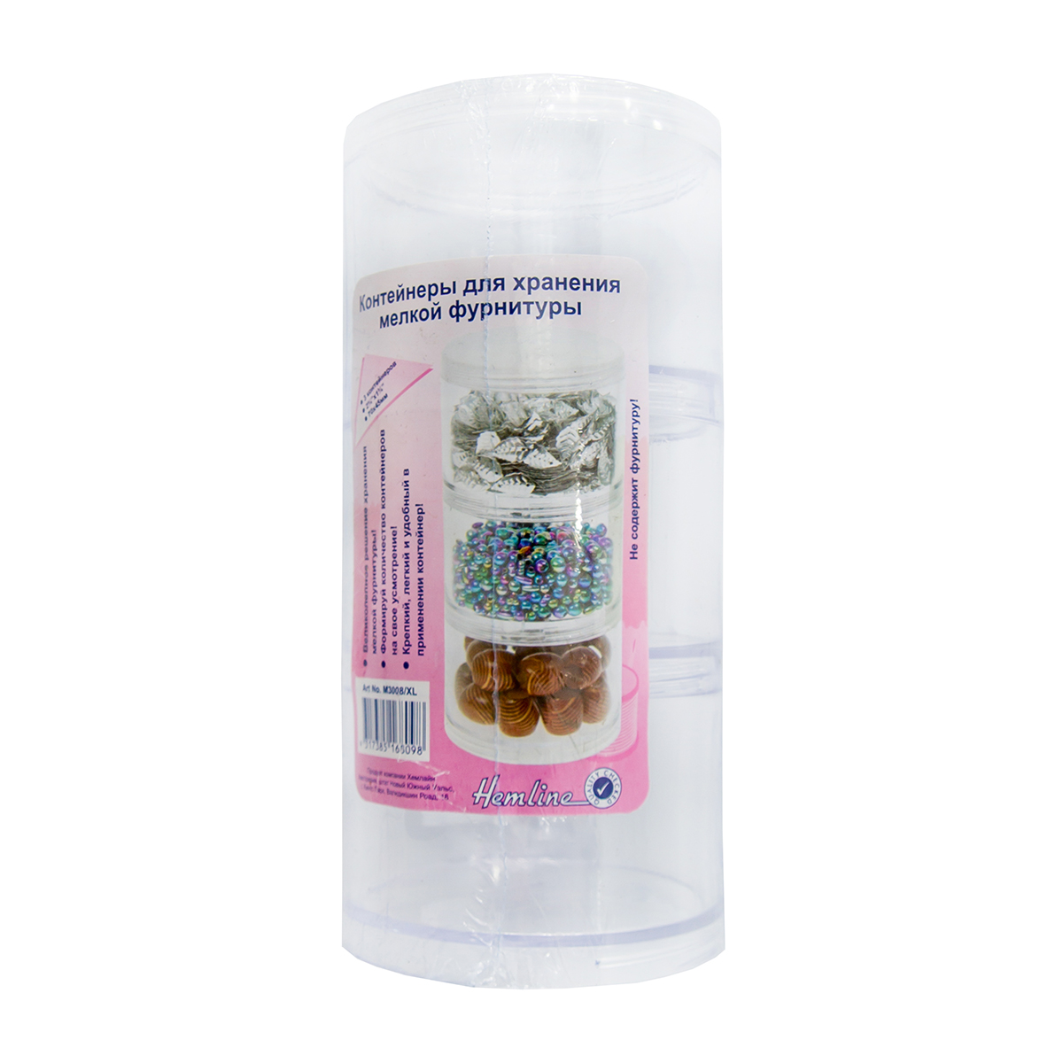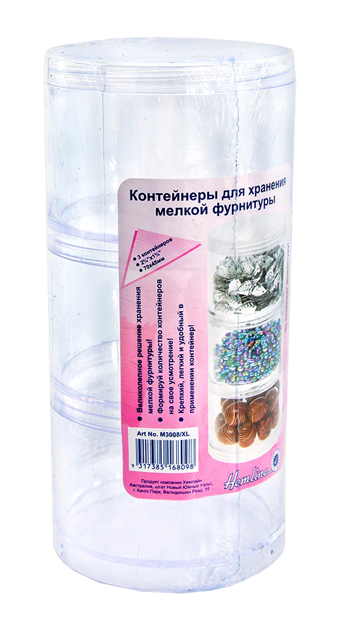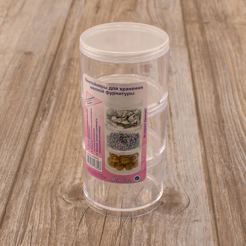 Набор из 3 круглых коробок с резьбой, накручивающихся одна на другую. Верхняя имеет завинчивающуюся крышку. Предназначается для хранения бисера, бусин, страз, булавок и прочих мелочей для шитья.