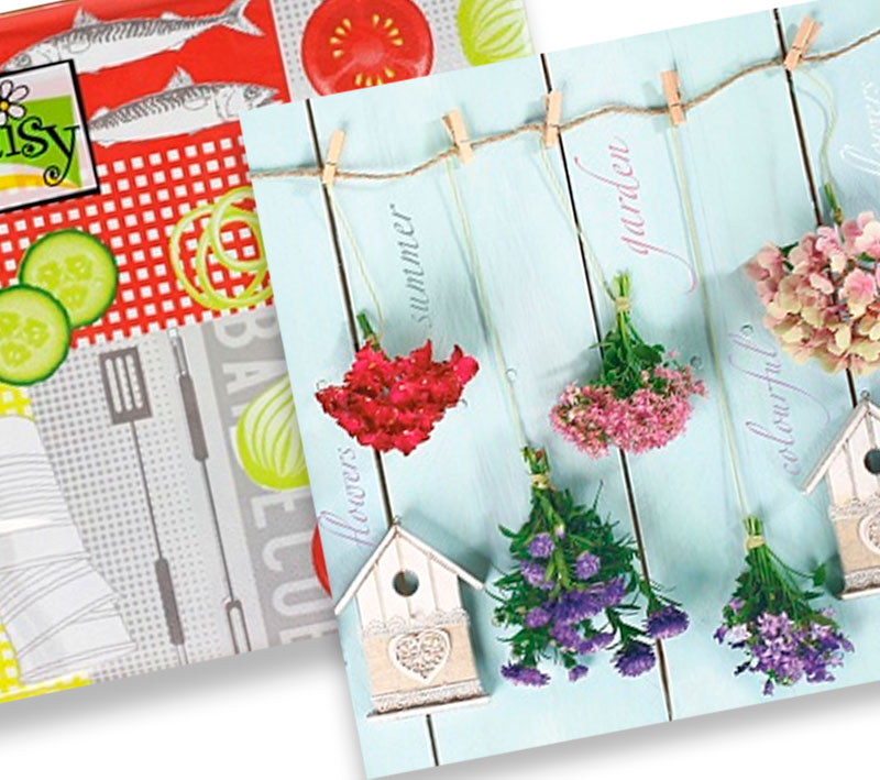 Собственная графическая студия позволяет компании предлагать покупателям товары с самыми разными дизайнами, а также постоянно обновлять коллекции с учетом модных тенденций и особенностей различных рынков сбыта. Ассортимент только праздничных салфеток насчитывает около 800 мотивов, в числе которых детские, свадебные, повседневные, поздравительные, посвященные Новому году и Рождеству, Пасхе, Дню святого Валентина и другим праздникам.