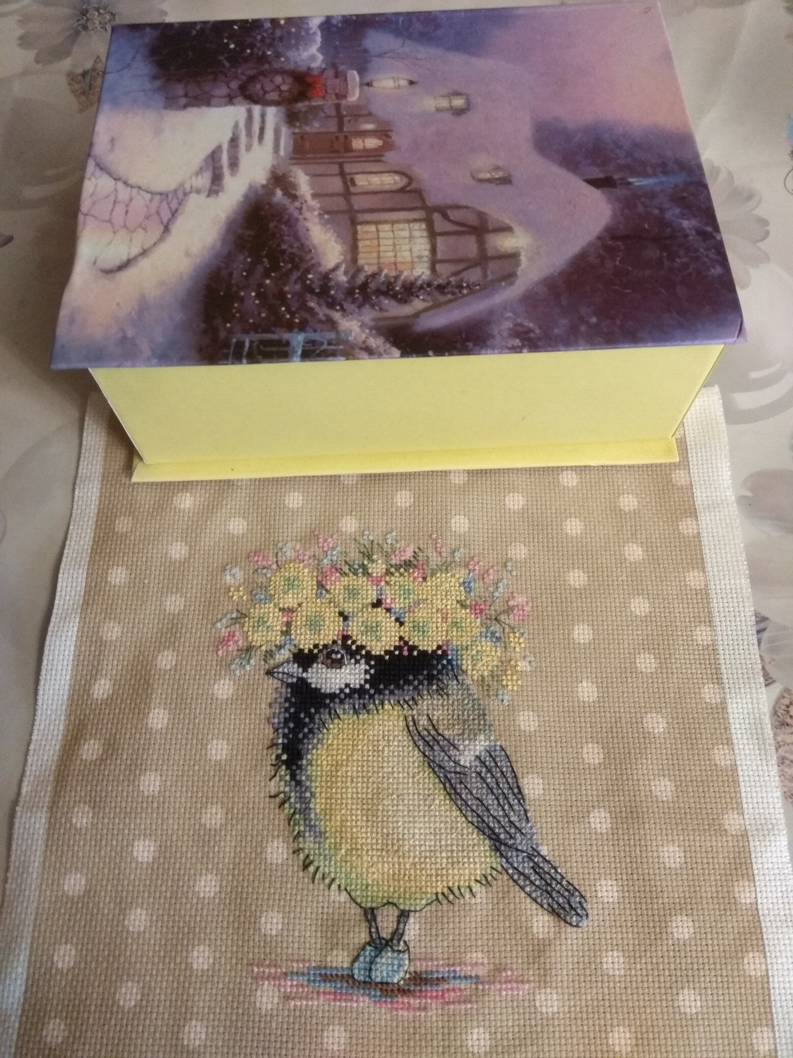 Так как я увлекаюсь прикладной вышивкой и у меня была в наличии заготовка (вышитая синичка) для оформления шкатулки, то внутреннюю часть шкатулки было решено оформить из данного фетра. Цвет я выбрала зеленый (арт.11.041.18), так как он лучше всех подходил к цветовой гамме шкатулки.