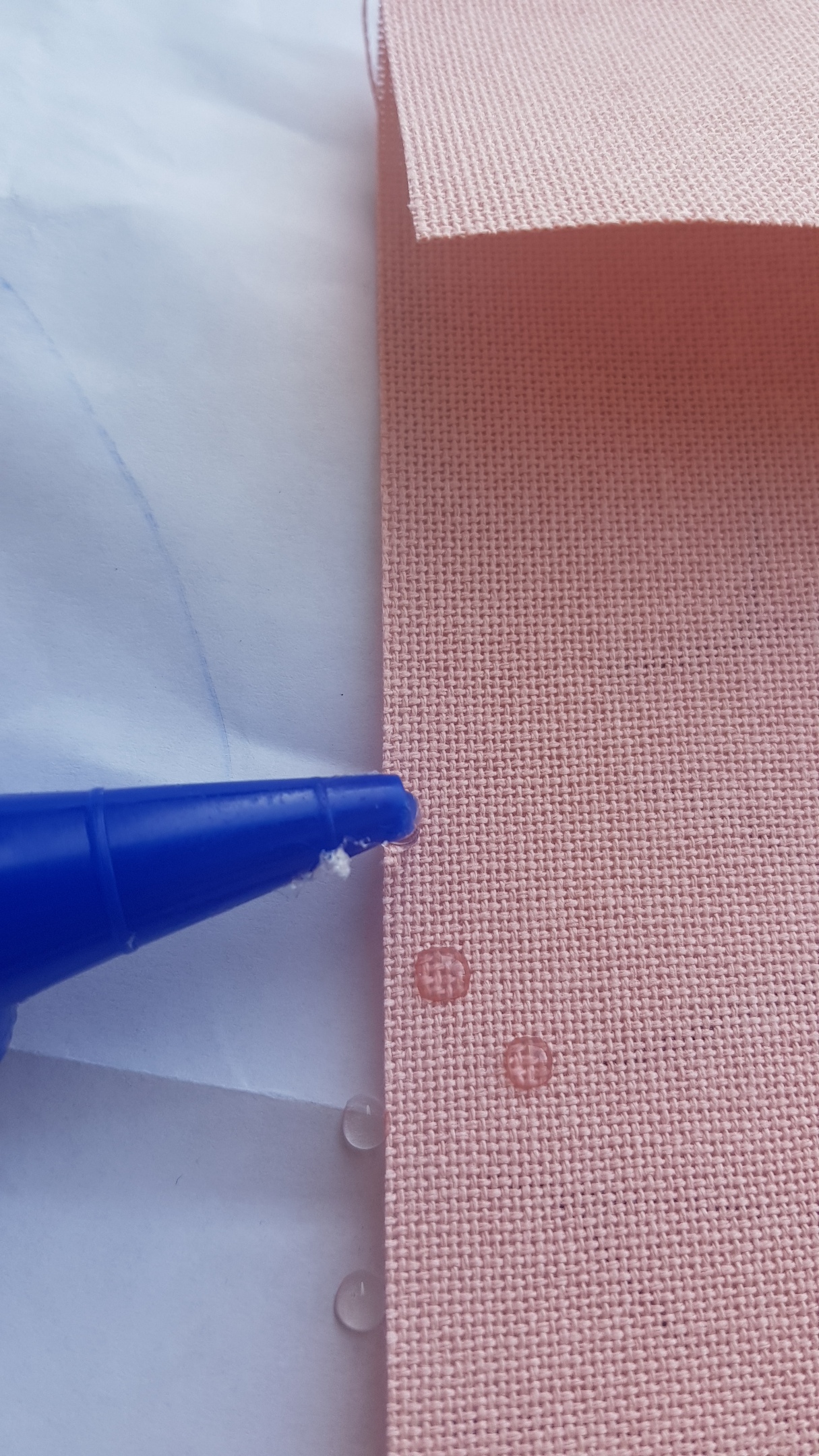 Данный бесцветный клей предназначен для ремонта текстильных изделий, укрепления кромок канвы для вышивки с целью избежания обтрёпывания. Упаковка идёт в виде блистера, поэтому советую сделать небольшое отверстие, чтобы клей выходил в малом количестве и не растекался. Данным средством я обработала край основы для вышивки (хлопок, вискоза). По фотографии видно, что капли попали на ткань и на их месте цвет немного потемнел, имейте это ввиду!